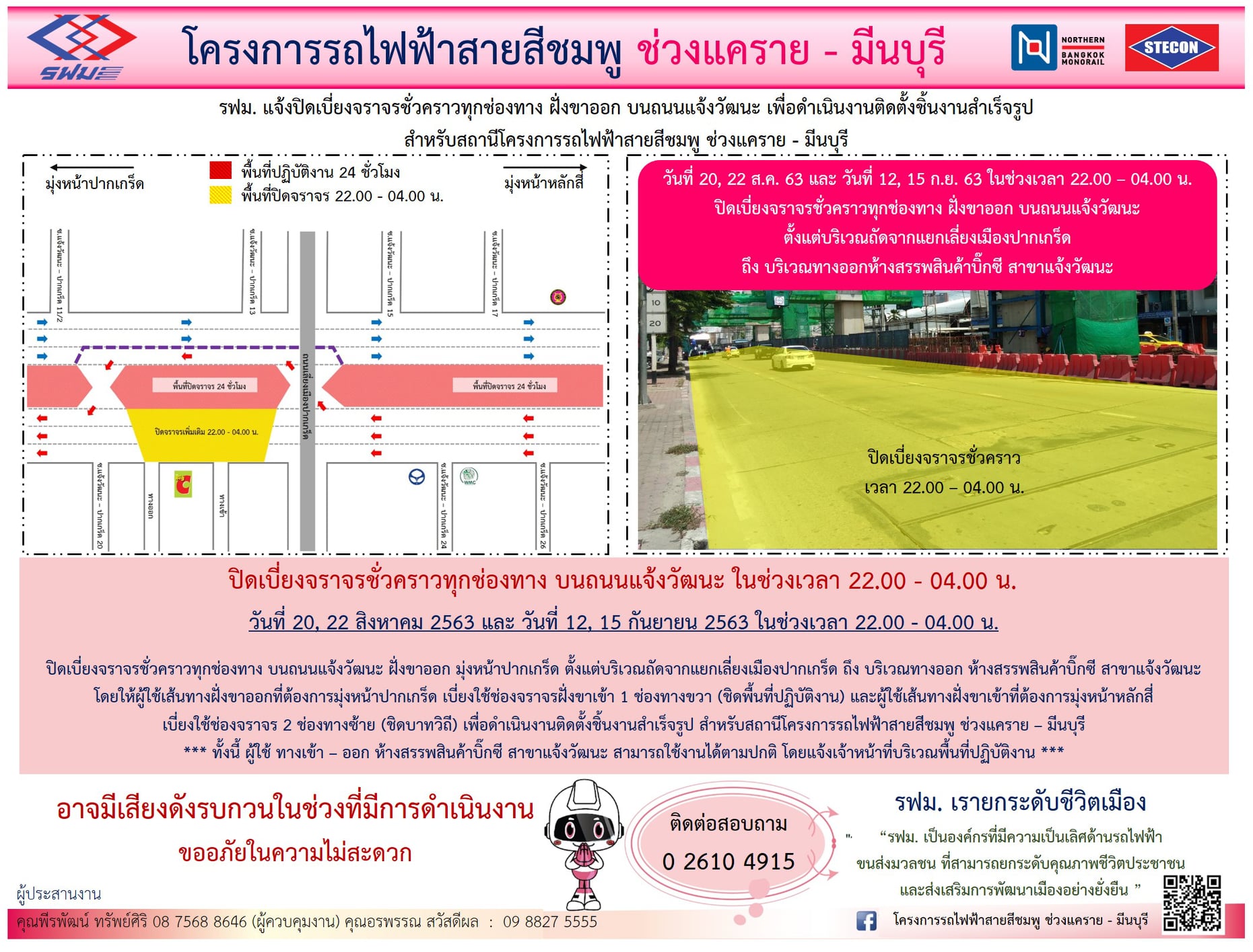 ปิดเบี่ยงจราจรชั่วคราวทุกช่องทาง บนถนนแจ้งวัฒนะ ฝั่งขาเข้าและฝั่งขาออก บริเวณถัดจากแยกเลี่ยงเมืองปากเกร็ด ถึง บริเวณทางออก ห้างสรรพสินค้าบิ๊กซี สาขาแจ้งวัฒนะ เพื่อดำเนินการติดตั้งชิ้นงานสำเร็จรูป สำหรับเสาสถานี วันที่ 20 – 23 สิงหาคม 2563 และ วันที่ 12 – 17 กันยายน 2563 เวลา 22.00 – 04.00 น.