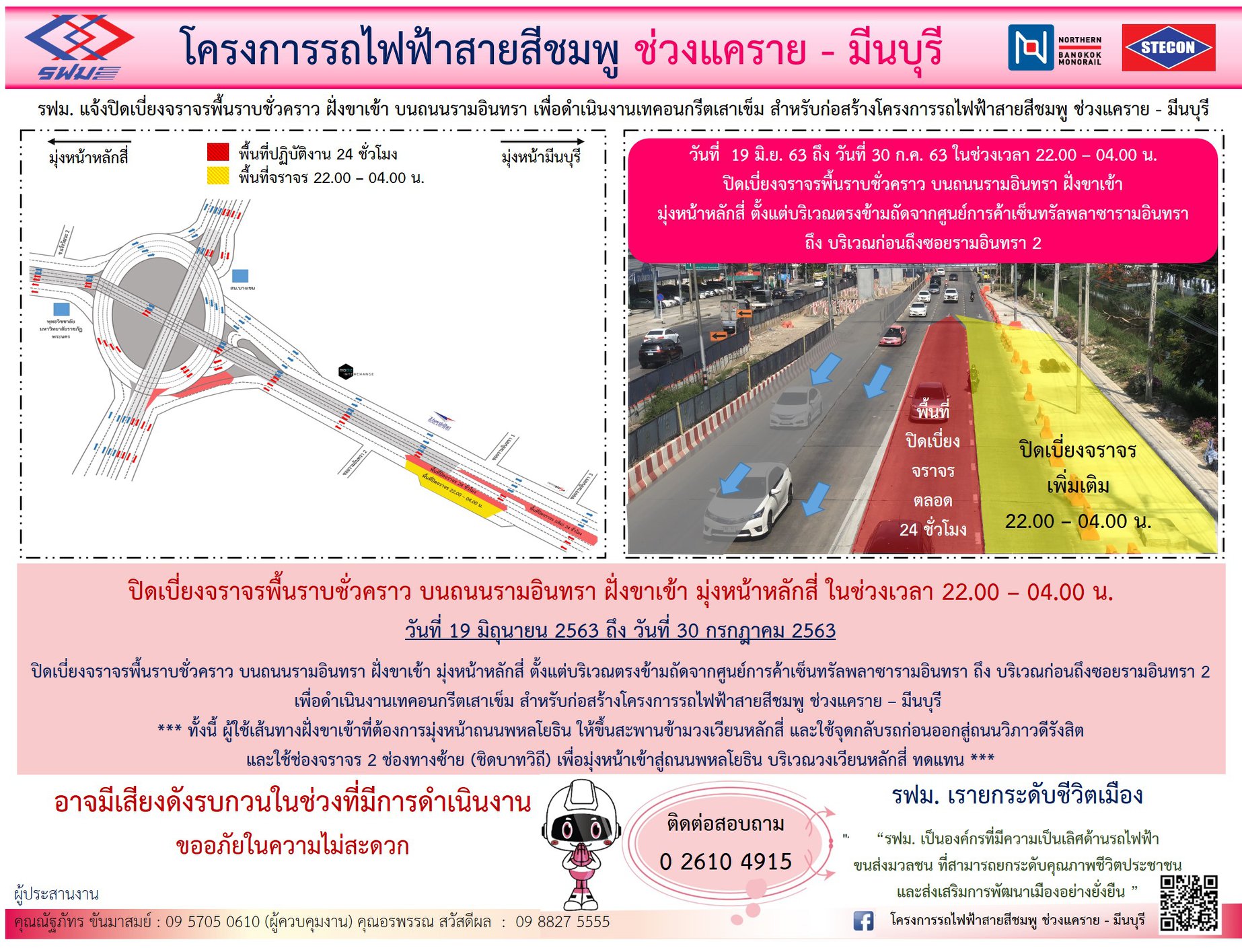ปิดเบี่ยงจราจรพื้นราบชั่วคราว บนถนนรามอินทรา ฝั่งขาเข้า มุ่งหน้าหลักสี่ บริเวณตรงข้ามถัดจากศูนย์การค้าเซ็นทรัลพลาซารามอินทรา ถึง บริเวณก่อนถึงซอยรามอินทรา 2 เพื่อดำเนินงานเทคอนกรีตเสาเข็ม ตั้งแต่วันที่ 19 มิถุนายน 2563 ถึง วันที่ 30 กรกฎาคม 2563 เวลา 22.00 – 04.00 น.