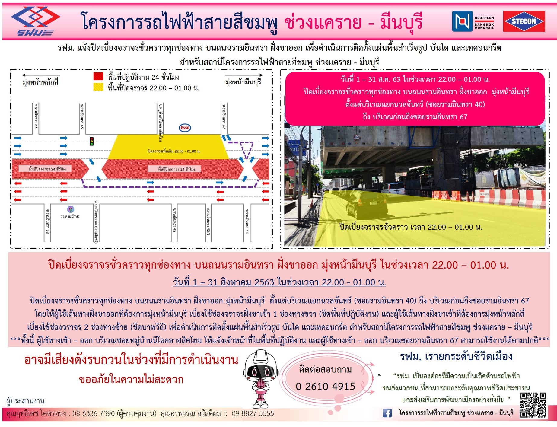 ปิดเบี่ยงจราจรชั่วคราวทุกช่องทาง บนถนนรามอินทรา ฝั่งขาเข้าและฝั่งขาออก ตั้งแต่บริเวณแยกนวลจันทร์ (ซอยรามอินทรา 40) ถึง บริเวณก่อนถึงซอยรามอินทรา 67 เพื่อดำเนินการติดตั้งแผ่นพื้นสำเร็จรูป บันได และเทคอนกรีต วันที่ 1 – 31 สิงหาคม 2563 เวลา 22.00 – 04.00 น.