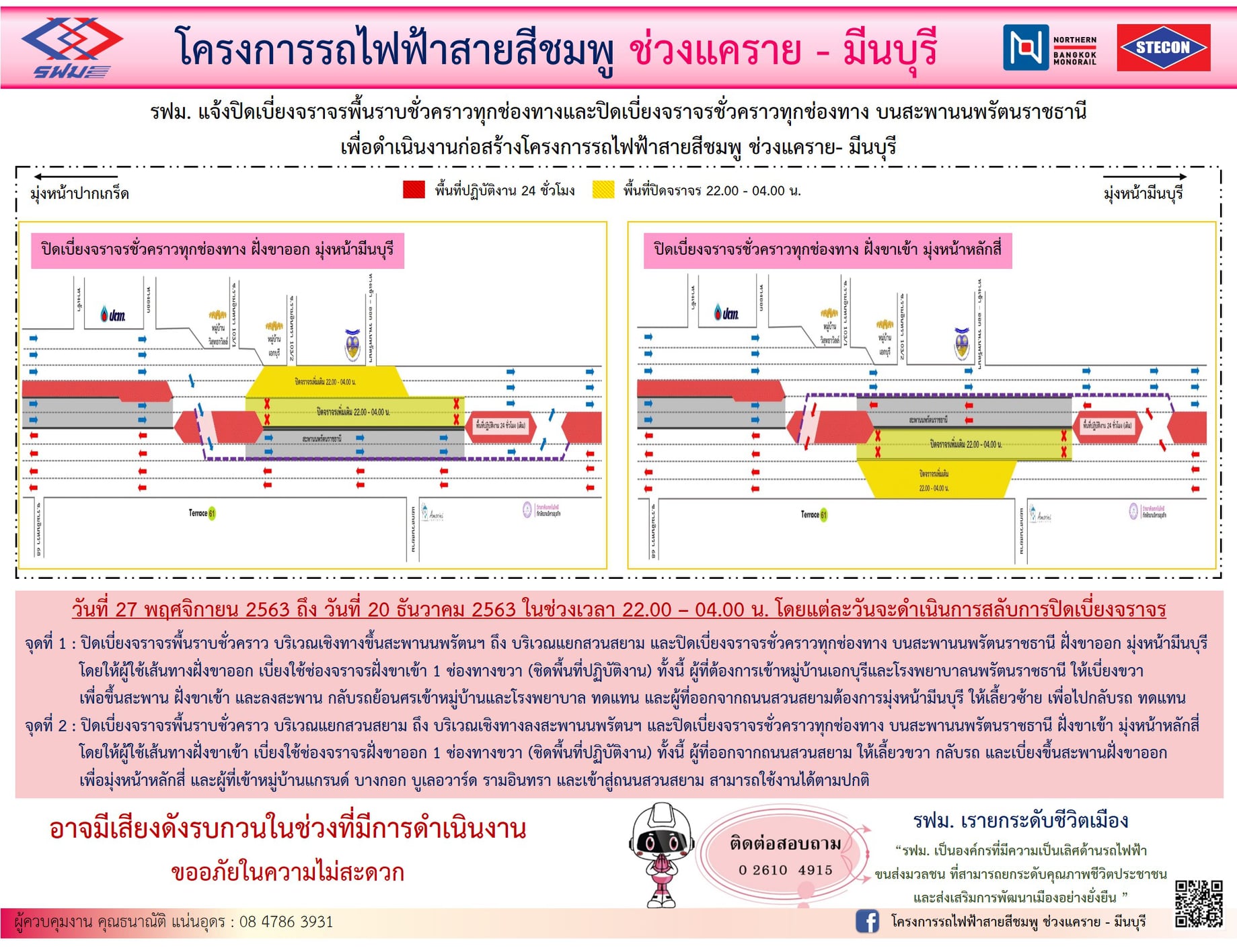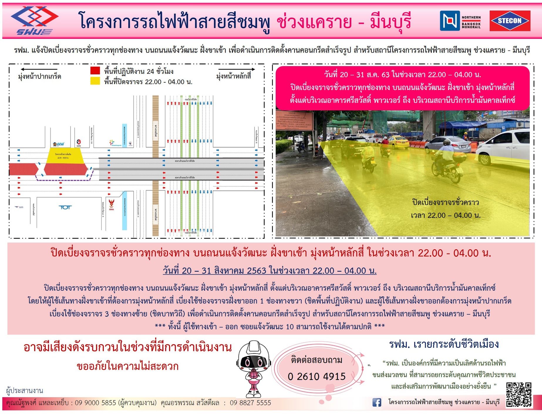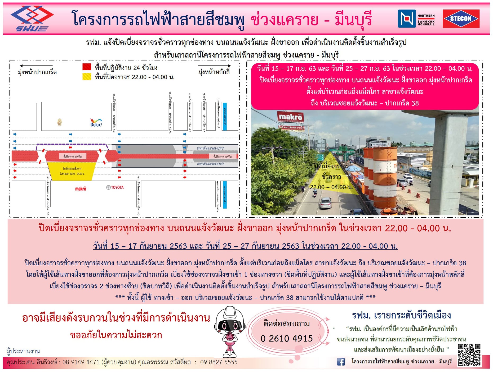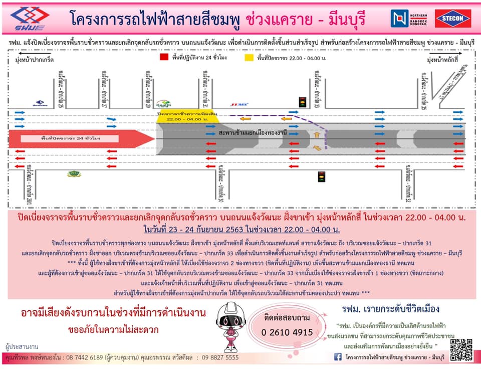 ปิดเบี่ยงจราจรชั่วคราวทุกช่องทาง บนถนนแจ้งวัฒนะ ฝั่งขาเข้าและฝั่งขาออก บริเวณก่อนถึงสำนักเครื่องกลและสื่อสาร กรมทางหลวง ถึง บริษัท อั๊คโซ่ โนเบล เพ้นท์ส (ประเทศไทย) จำกัด เพื่อดำเนินงานติดตั้งชิ้นงานสำเร็จรูป สำหรับเสาสถานี วันที่ 8 -10, 15 – 17, 20 – 22 และ 25 – 27 กันยายน 2563 เวลา 22.00 – 04.00 น.