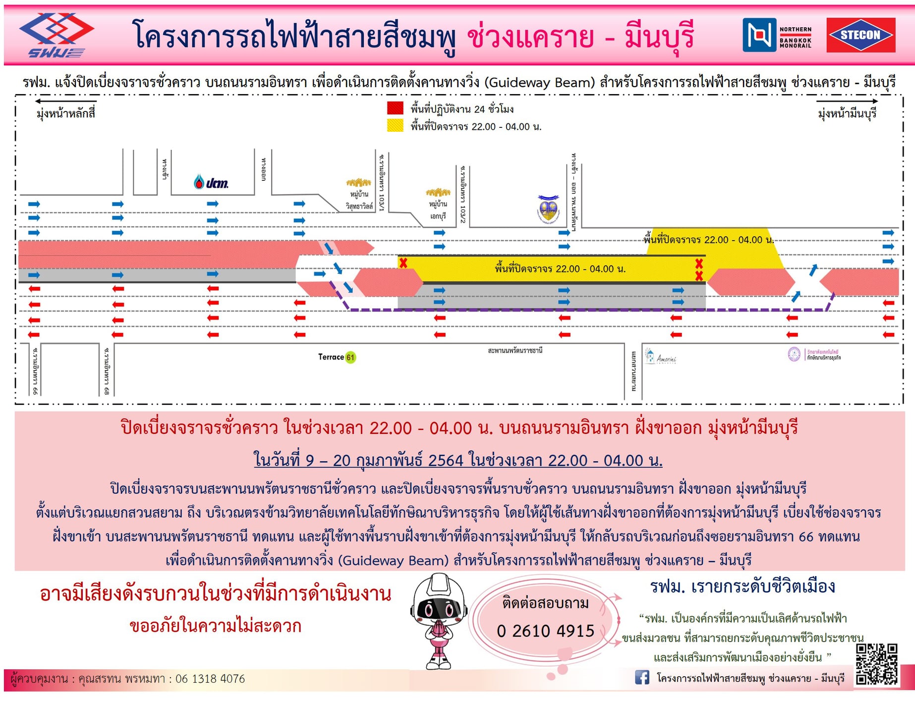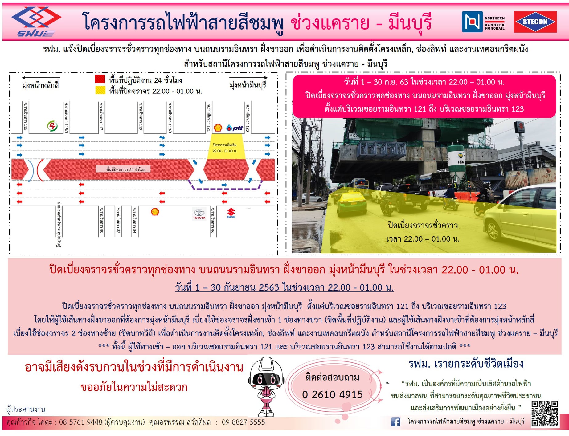 ปิดเบี่ยงจราจรชั่วคราวทุกช่องทาง บนถนนรามอินทรา ฝั่งขาเข้าและฝั่งขาออก ตั้งแต่บริเวณซอยรามอินทรา 121 ถึง บริเวณซอยรามอินทรา 123 เพื่อดำเนินการงานติดตั้งโครงเหล็ก, ช่องลิฟท์ และงานเทคอนกรีตผนัง วันที่ 1 – 30 กันยายน 2563 เวลา 22.00 – 04.00 น.