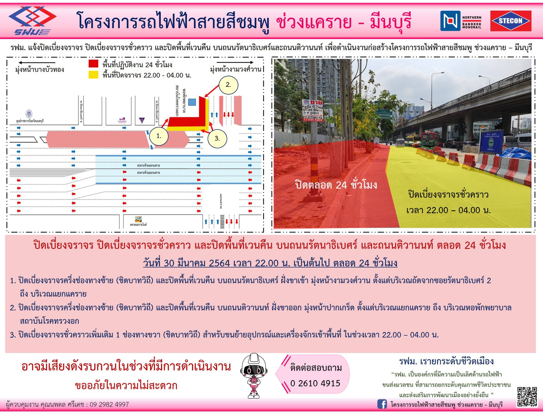ปิดเบี่ยงจราจร ปิดเบี่ยงจราจรชั่วคราว และปิดพื้นที่เวนคืน บนถนนรัตนาธิเบศร์และถนนติวานนท์ บริเวณถัดจากซอยรัตนาธิเบศร์ 2 ถึง บริเวณหอพักพยาบาล สถาบันโรคทรวงอก ก่อนถึงซอยติวานนท์ 9 วันที่ 30 มีนาคม 2564 เวลา 22.00 น. เป็นต้นไป ตลอด 24 ชั่วโมง
