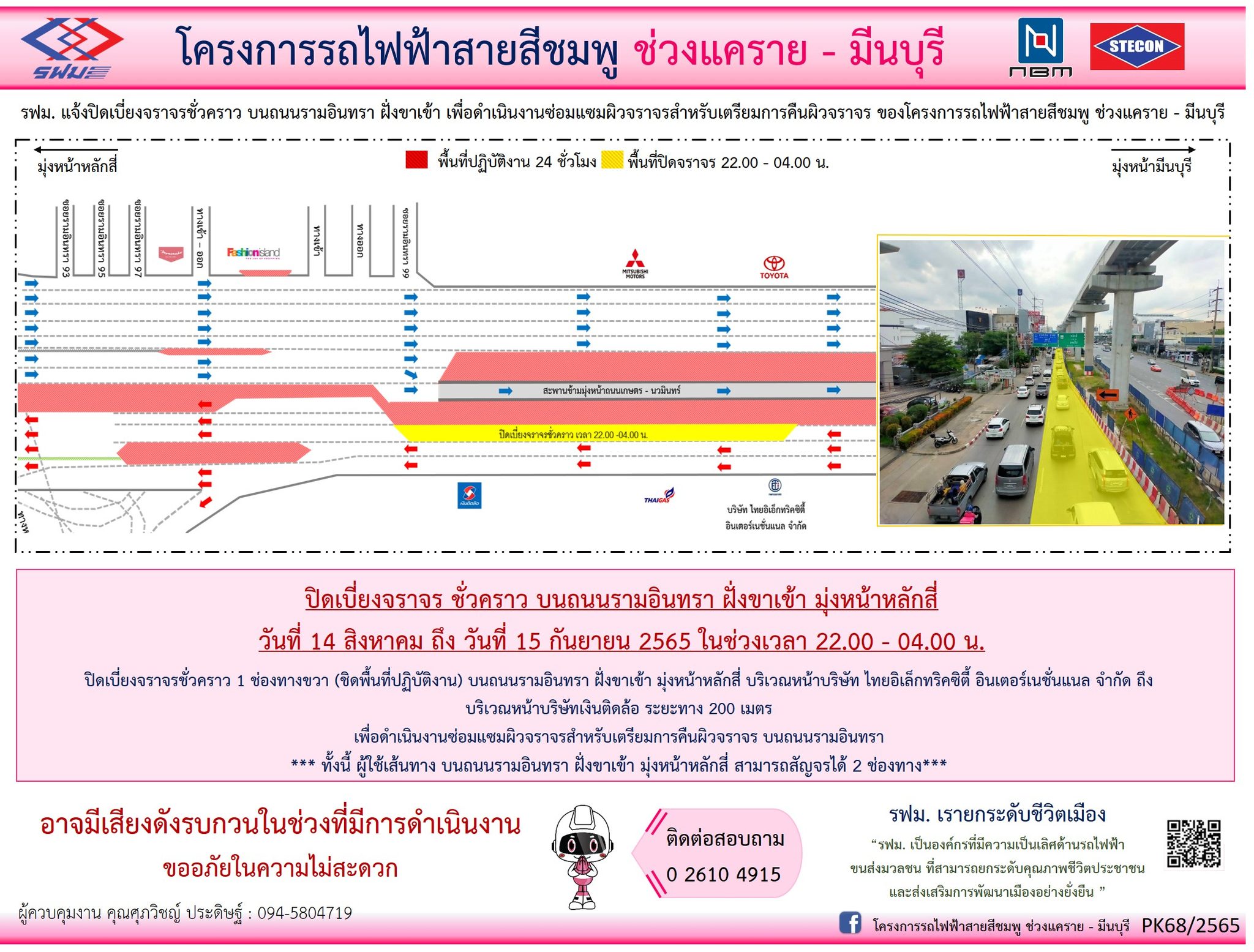 ปิดเบี่ยงจราจรชั่วคราว 1 ช่องทางขวา (ชิดพื้นที่ปฏิบัติงาน) บนถนนรามอินทรา ฝั่งขาเข้า มุ่งหน้าหลักสี่ บริเวณหน้าบริษัท ไทยอิเล็กทริคซิตี้ อินเตอร์เนชั่นแนล จำกัด ถึง บริเวณหน้าบริษัทเงินติดล้อ วันที่ 14 สิงหาคม ถึง วันที่ 15 กันยายน 2565 เวลา 22.00 – 04.00 น. เพื่อดำเนินงานซ่อมแซมผิวจราจรสำหรับเตรียมการคืนผิวจราจร
