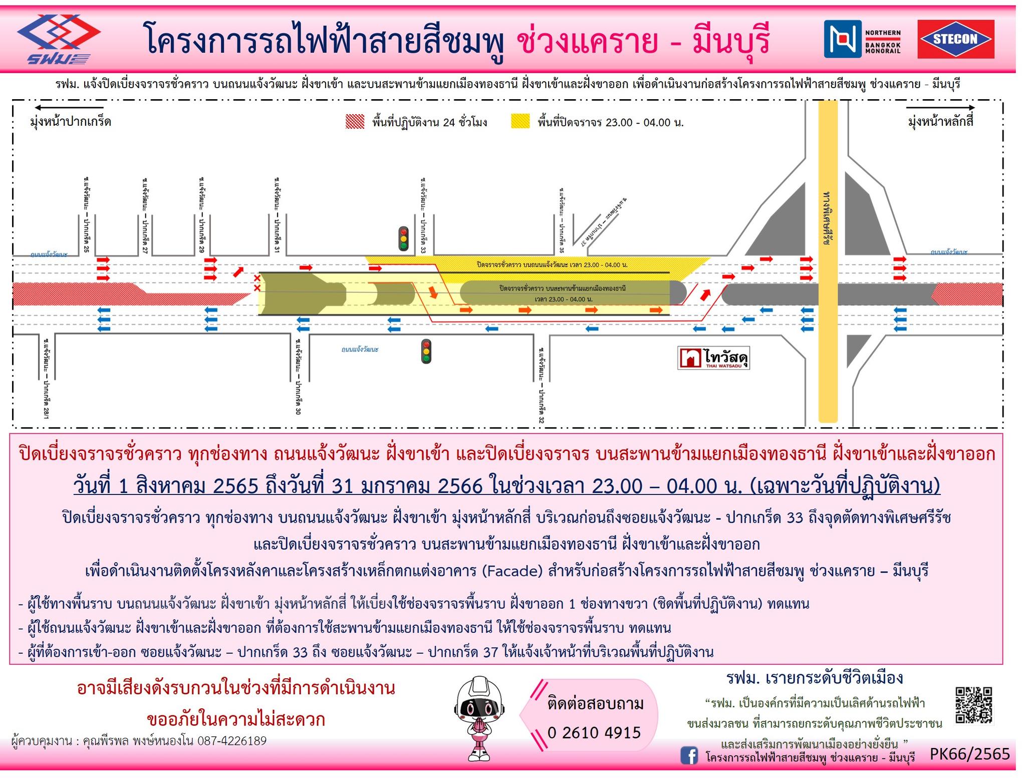 ปิดเบี่ยงจราจรชั่วคราว ทุกช่องทาง บนถนนแจ้งวัฒนะ ฝั่งขาเข้า มุ่งหน้าหลักสี่ บริเวณก่อนถึงซอยแจ้งวัฒนะ – ปากเกร็ด 33 ถึง จุดตัดทางพิเศษศรีรัช และปิดเบี่ยงจราจรชั่วคราว บนสะพานข้ามแยกเมืองทองธานี ฝั่งขาเข้าและฝั่งขาออก วันที่ 1 สิงหาคม 2565 ถึงวันที่ 31 มกราคม 2566 เวลา 23.00 – 04.00 น. เพื่อดำเนินงานติดตั้งโครงหลังคาและโครงสร้างเหล็กตกแต่งอาคาร (Facade)