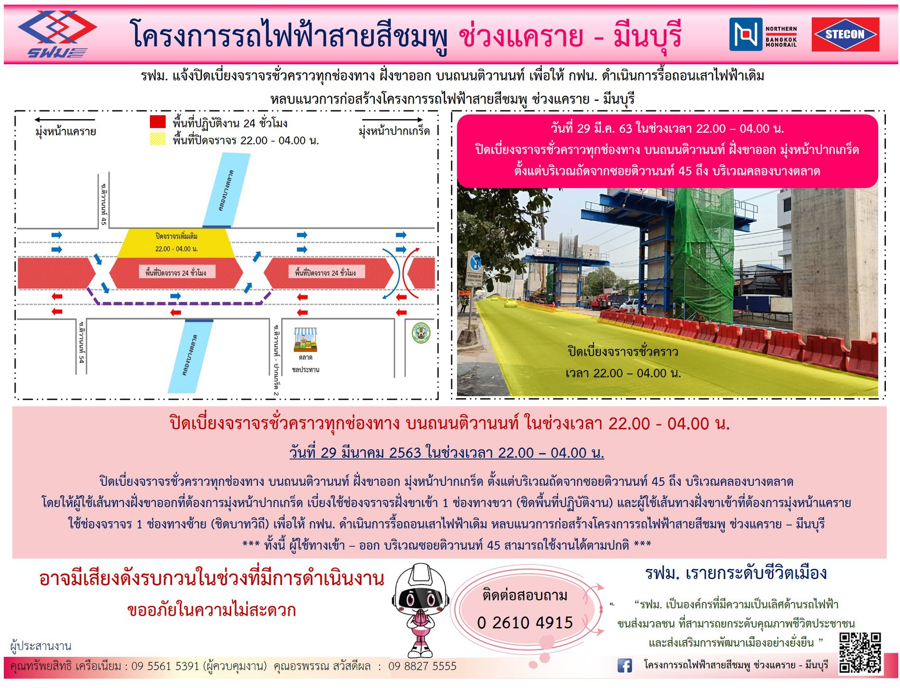 ปิดเบี่ยงจราจรชั่วคราวทุกช่องทาง บนถนนติวานนท์ ฝั่งขาออก เพื่อให้ กฟน. ดำเนินการรื้อถอนเสาไฟฟ้าเดิม หลบแนวการก่อสร้าง วันที่ 29 มีนาคม 2563