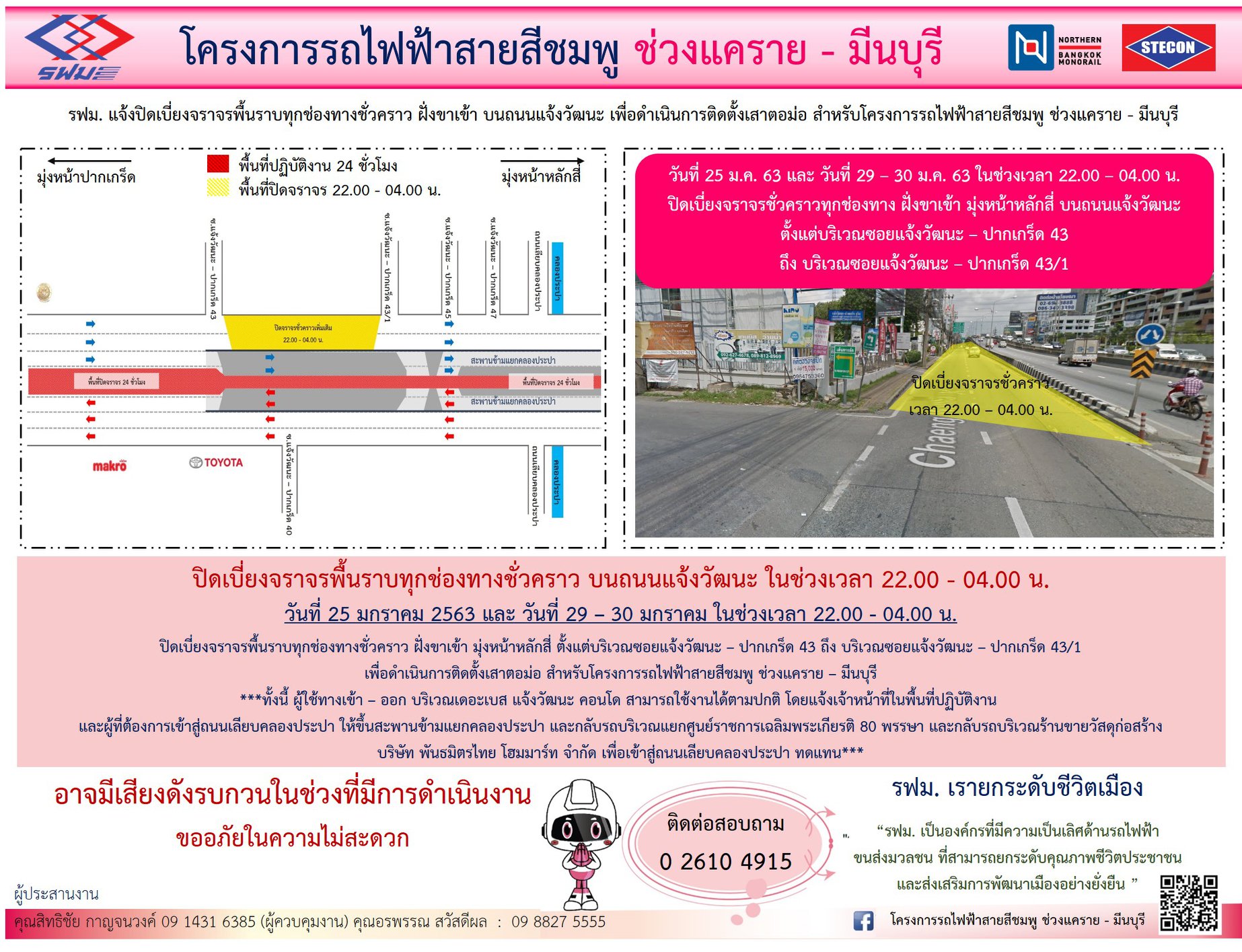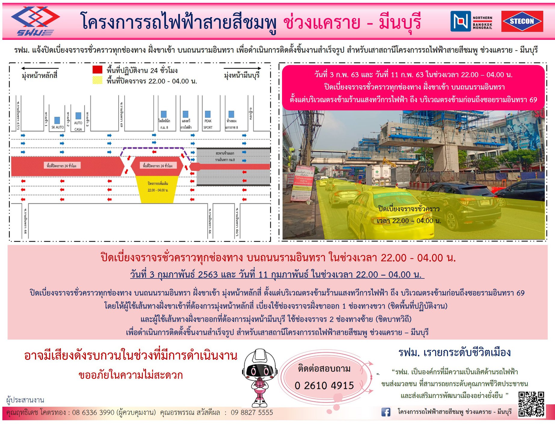 ปิดเบี่ยงจราจรชั่วคราวทุกช่องทาง บนถนนรามอินทรา ฝั่งขาออก เพื่อดำเนินการติดตั้งชิ้นงานสำเร็จรูป สำหรับเสาสถานีวันที่ 19 – 21 กุมภาพันธ์ 2563