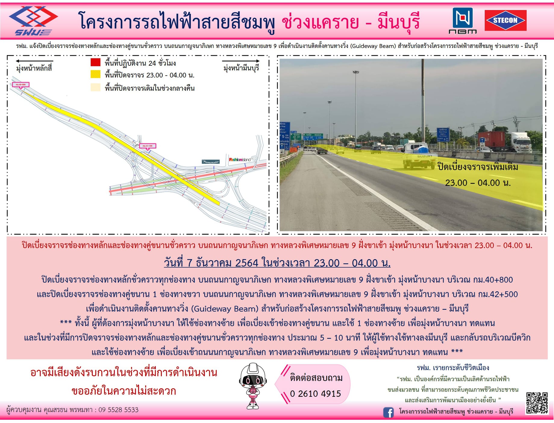 ปิดเบี่ยงจราจรช่องทางหลักและช่องทางคู่ขนานชั่วคราว บนถนนกาญจนาภิเษก ทางหลวงพิเศษหมายเลข 9 ฝั่งขาเข้า มุ่งหน้าบางนา บริเวณ กม.40+800 และ กม.42+500 วันที่ 7 ธันวาคม 2564 เวลา 23.00 – 04.00 น. เพื่อดำเนินงานติดตั้งคานทางวิ่ง (Guideway Beam)