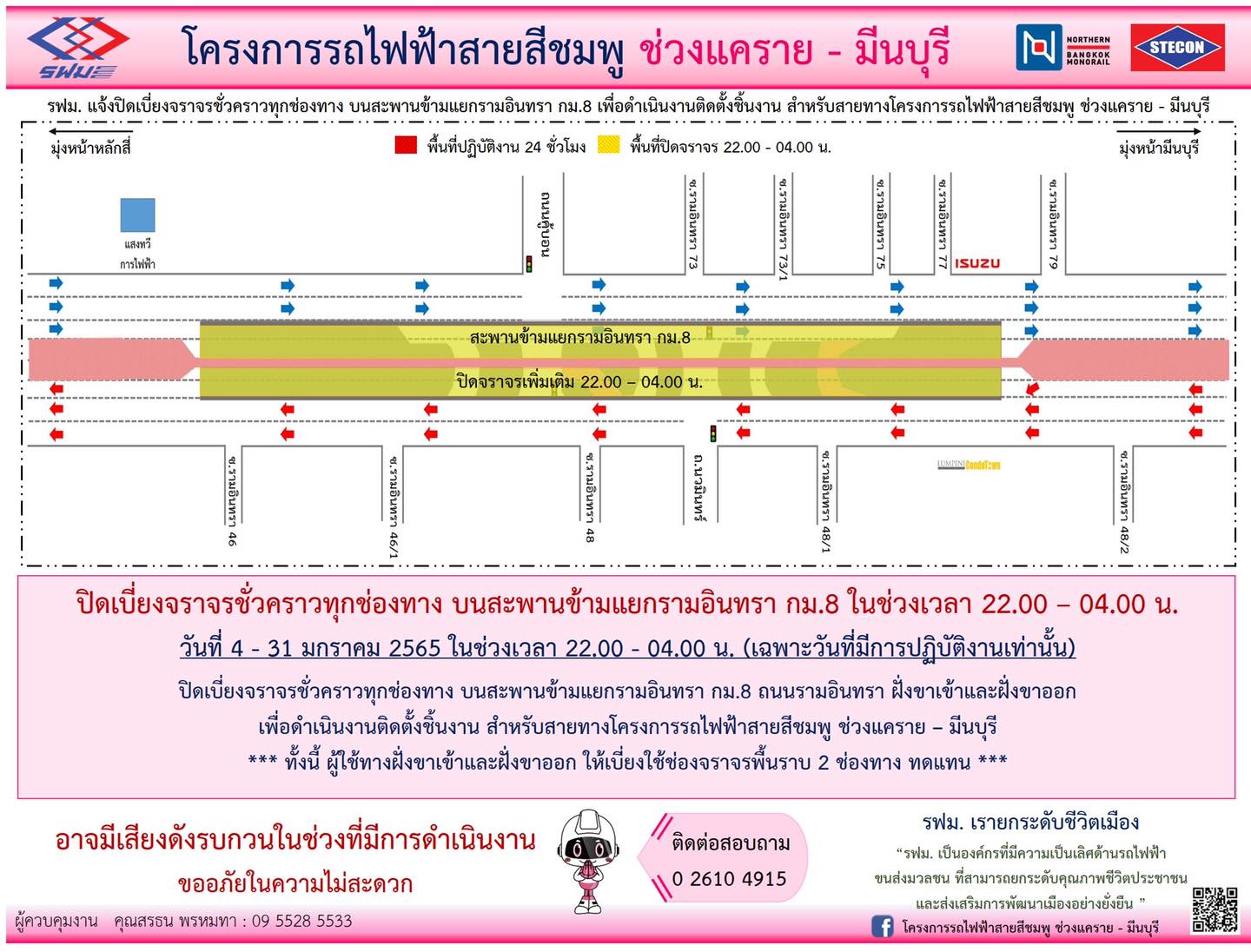 ปิดเบี่ยงจราจรชั่วคราว บนถนนรามอินทรา ฝั่งขาเข้าและฝั่งขาออก บริเวณซอยรามอินทรา 113 ถึง บริเวณซอยรามอินทรา 123 วันที่ 1 สิงหาคม 2564 ถึง วันที่ 30 กันยายน 2564 เวลา 22.00 – 04.00 น. เพื่อดำเนินงานก่อสร้างสถานี