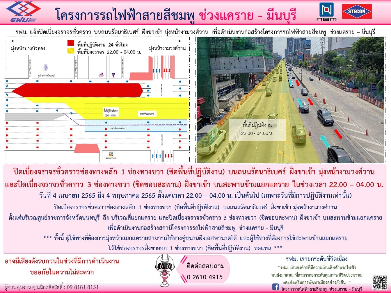 ปิดเบี่ยงจราจรชั่วคราวช่องทางหลัก 1 ช่องทางขวา บนถนนรัตนาธิเบศร์ ฝั่งขาเข้า มุ่งหน้างามวงศ์วานบริเวณศูนย์ราชการจังหวัดนนทบุรี ถึง บริเวณสี่แยกแคราย และปิดเบี่ยงจราจรชั่วคราว 3 ช่องทางขวา (ชิดขอบสะพาน) ฝั่งขาเข้า บนสะพานข้ามแยกแคราย วันที่ 4 เมษายน 2565 ถึง วันที่ 4 พฤษภาคม 2565 เป็นต้นไป เวลา 22.00 – 04.00 น. (เฉพาะวันที่มีการปฏิบัติงานเท่านั้น)