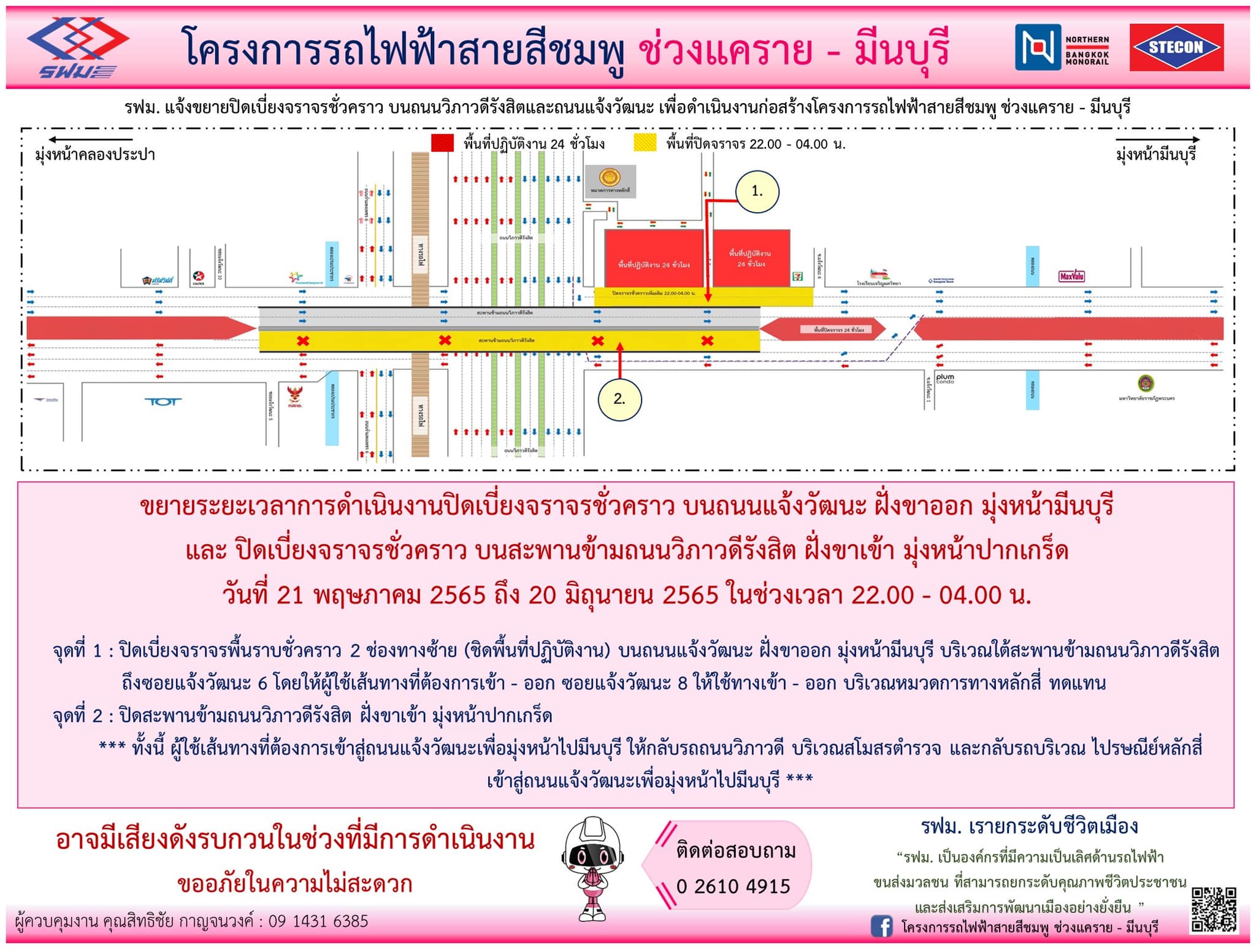 ขยายปิดเบี่ยงจราจรพื้นราบชั่วคราว ทุกช่องทาง บนถนนแจ้งวัฒนะ ฝั่งขาออก มุ่งหน้ามีนบุรี และ ขยายปิดเบี่ยงจราจรชั่วคราว ทุกช่องทาง บนสะพานข้ามถนนวิภาวดีรังสิต ฝั่งขาเข้า มุ่งหน้าปากเกร็ด วันที่ 21 พฤษภาคม 2565 ถึง 20 มิถุนายน 2565 ในช่วงเวลา 22.00 – 04.00 น.