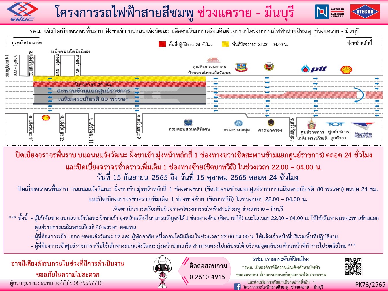 ปิดเบี่ยงจราจรพื้นราบ บนถนนแจ้งวัฒนะ ฝั่งขาเข้า มุ่งหน้าหลักสี่ 1 ช่องทางขวา (ชิดสะพานข้ามแยกศูนย์ราชการเฉลิมพระเกียรติ 80 พรรษา) วันที่ 15 กันยายน 2565 ถึง วันที่ 15 ตุลาคม 2565 ตลอด 24 ชม. และปิดเบี่ยงจราจรชั่วคราวเพิ่มเติม 1 ช่องทางซ้าย(ชิดบาทวิถี) วันที่ 15 กันยายน 2565 ถึง วันที่ 15 ตุลาคม 2565 เวลา 22.00 – 04.00 น. เพื่อดำเนินการเตรียมคืนผิวจราจร