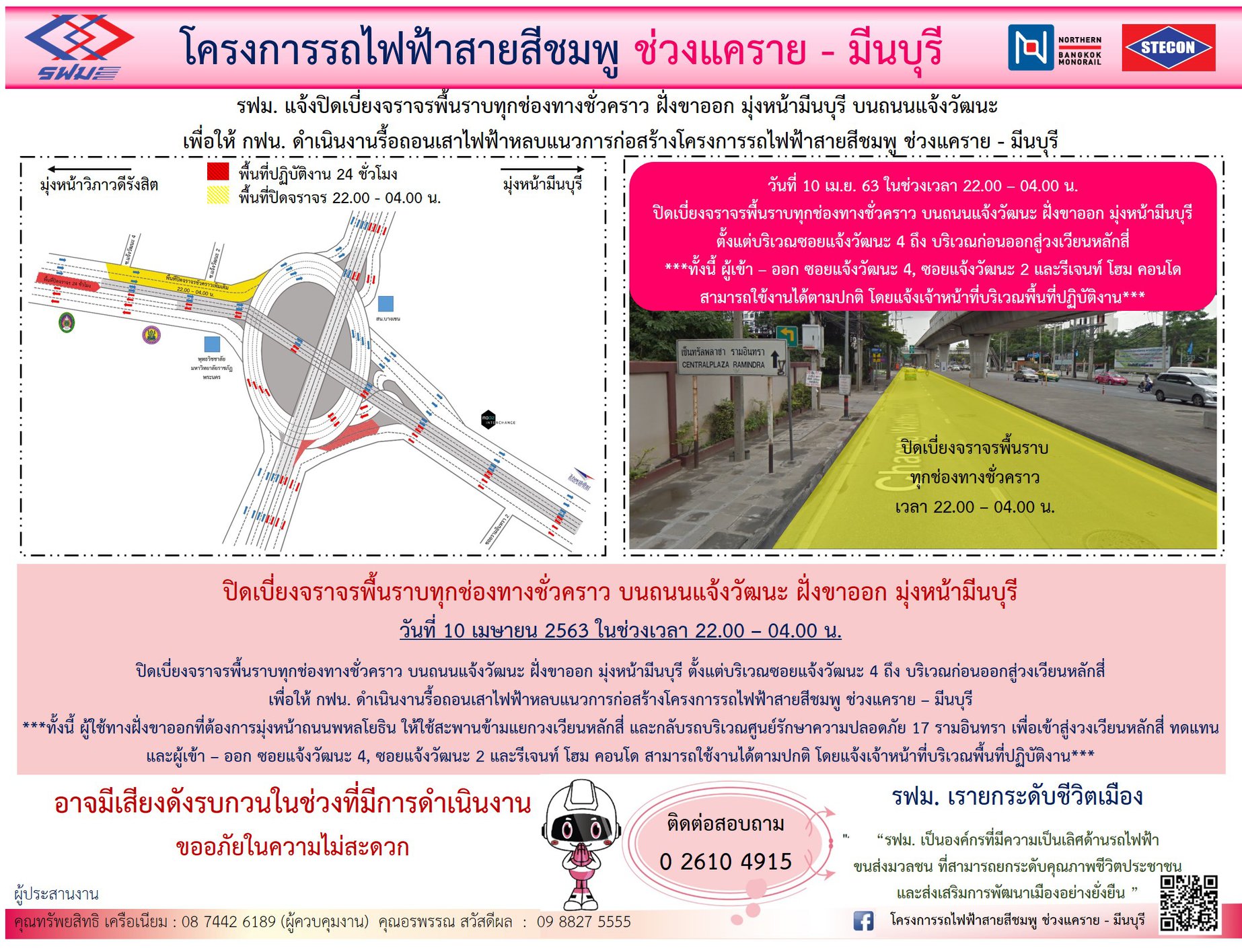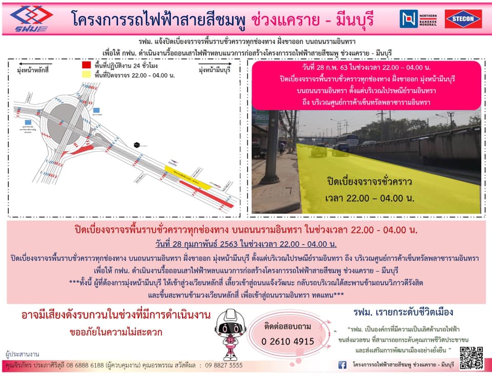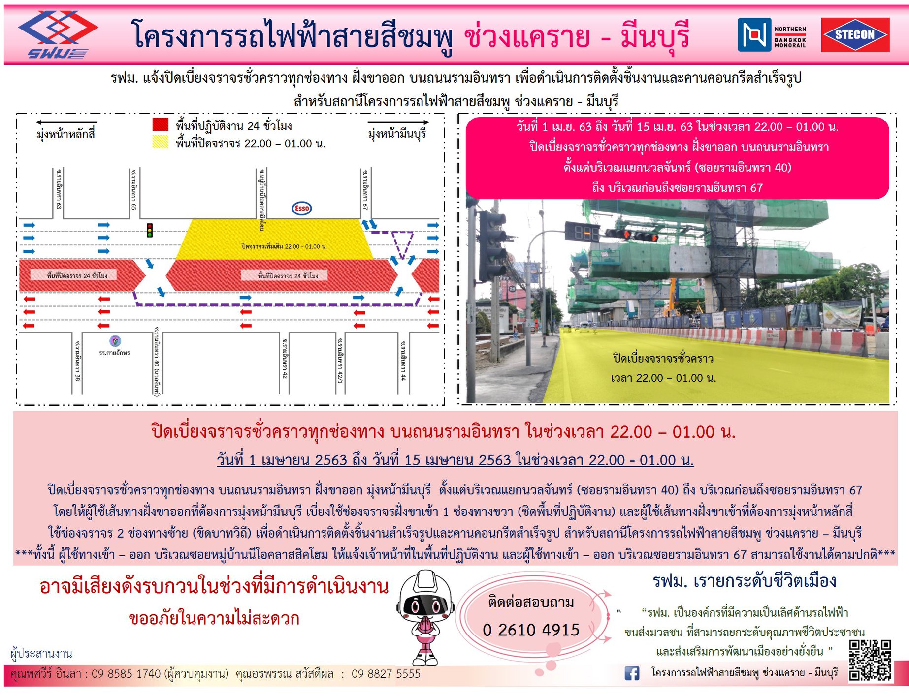 ปิดเบี่ยงจราจรชั่วคราวทุกช่องทาง บนถนนรามอินทรา ฝั่งขาเข้าและฝั่งขาออก เพื่อดำเนินการติดตั้งชิ้นงานสำเร็จรูปและคานคอนกรีตสำเร็จรูป สำหรับสถานี วันที่ 1 – 15 เมษายน 2563