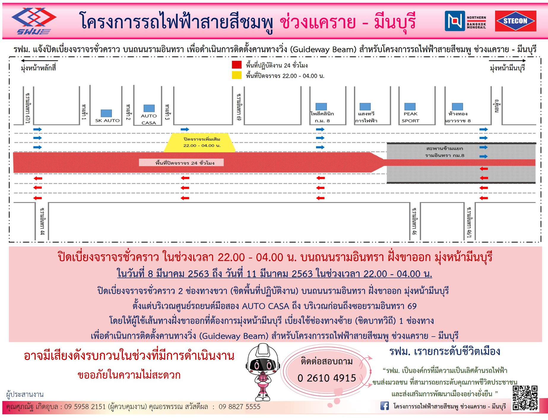 ปิดเบี่ยงจราจรชั่วคราว บนถนนรามอินทรา ฝั่งขาออก เพื่อดำเนินการติดตั้งคานทางวิ่ง (Guideway Beam) วันที่ 8 – 11 มีนาคม 2563