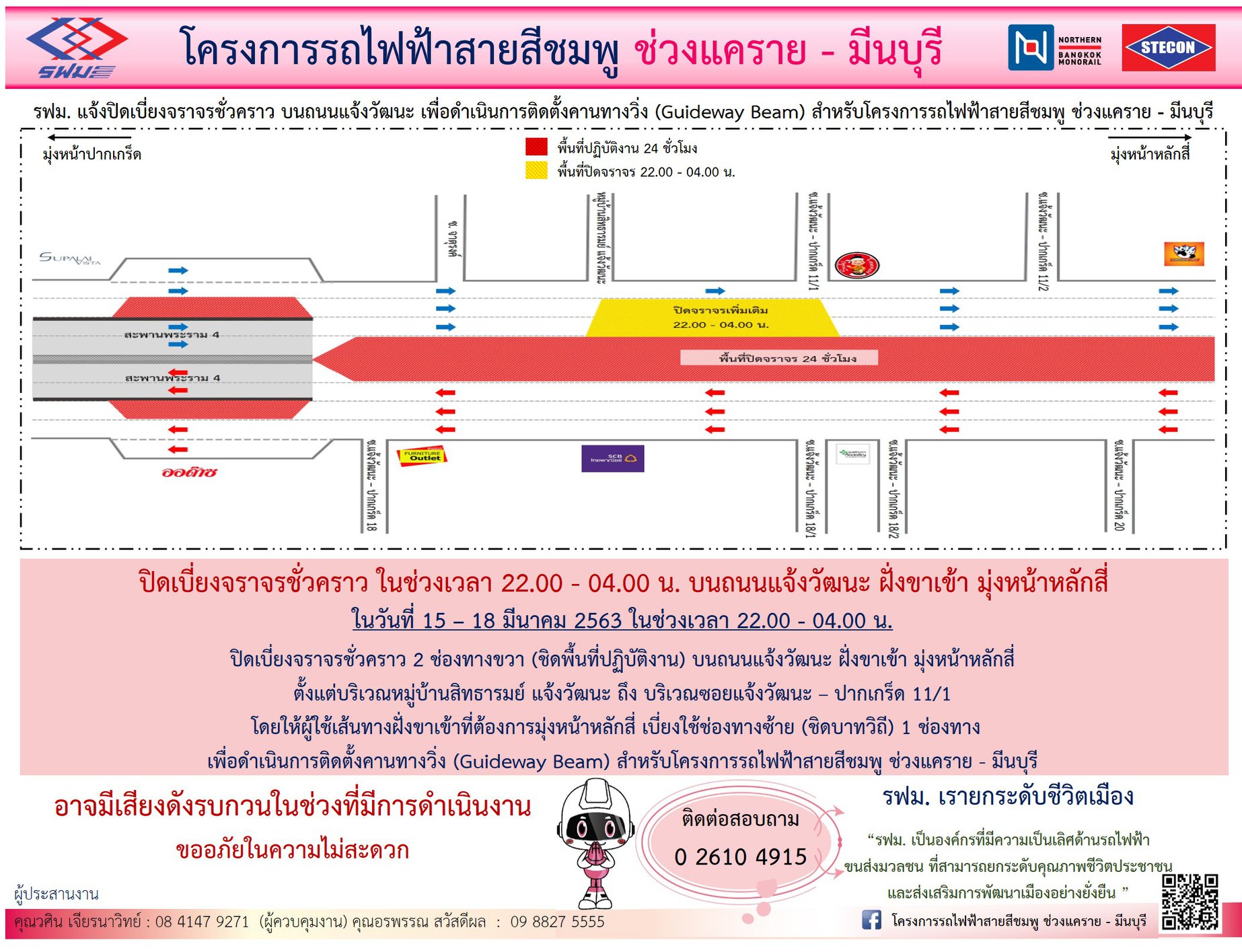 ปิดเบี่ยงจราจรชั่วคราว บนถนนแจ้งวัฒนะ ฝั่งขาเข้า เพื่อดำเนินการติดตั้งคานทางวิ่ง (Guideway Beam) วันที่ 15 – 18 มีนาคม 2563