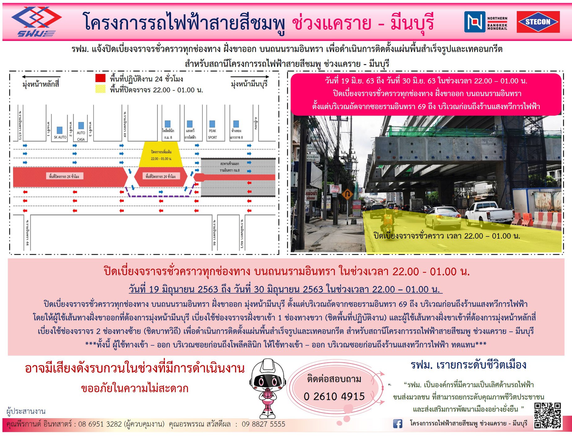 ปิดเบี่ยงจราจรชั่วคราวทุกช่องทาง บนถนนรามอินทรา ฝั่งขาเข้าและฝั่งขาออก ตั้งแต่บริเวณถัดจากซอยรามอินทรา 69 ถึง บริเวณก่อนถึงร้านแสงทวีการไฟฟ้า เพื่อดำเนินการติดตั้งแผ่นพื้นสำเร็จรูปและเทคอนกรีต วันที่ 19 – 30 มิถุนายน 2563 เวลา 22.00 – 04.00 น.