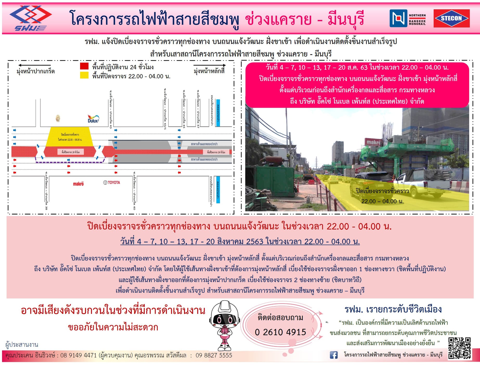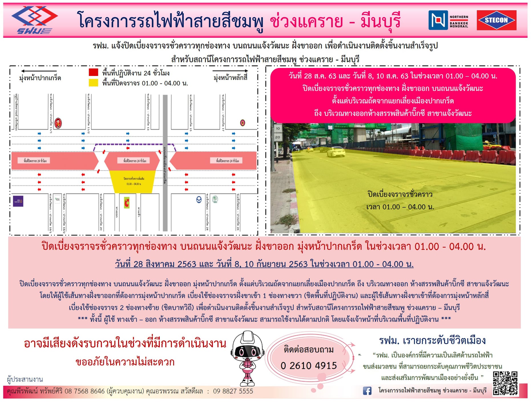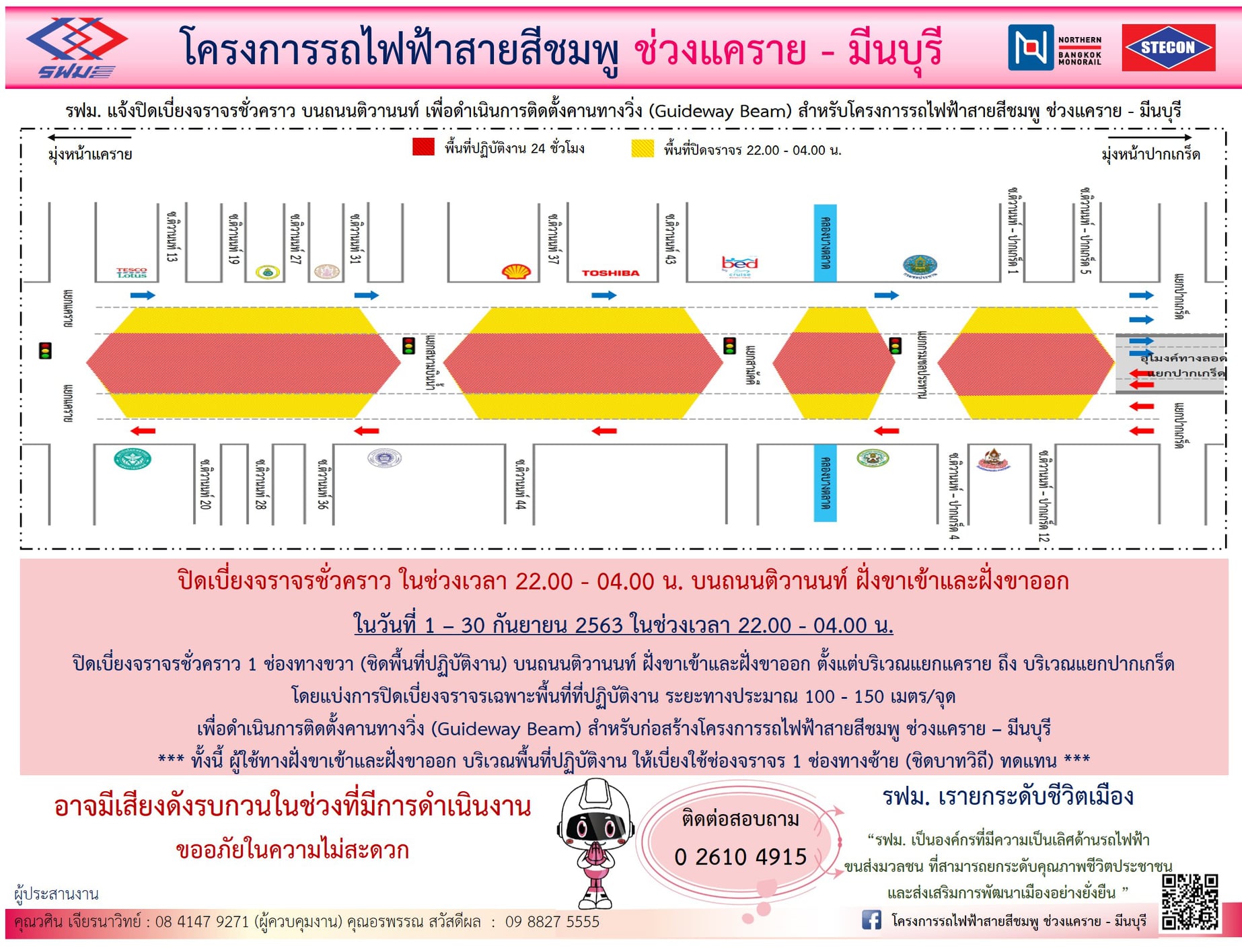 ปิดเบี่ยงจราจรชั่วคราว บนถนนติวานนท์ ถนนแจ้งวัฒนะ และถนนรามอินทรา ตั้งแต่บริเวณแยกแคราย ถึง บริเวณก่อนถึงแยกเมืองมีน เพื่อดำเนินการติดตั้งคานทางวิ่ง (Guideway Beam) วันที่ 1 – 30 กันยายน 2563 เวลา 22.00 – 04.00 น.