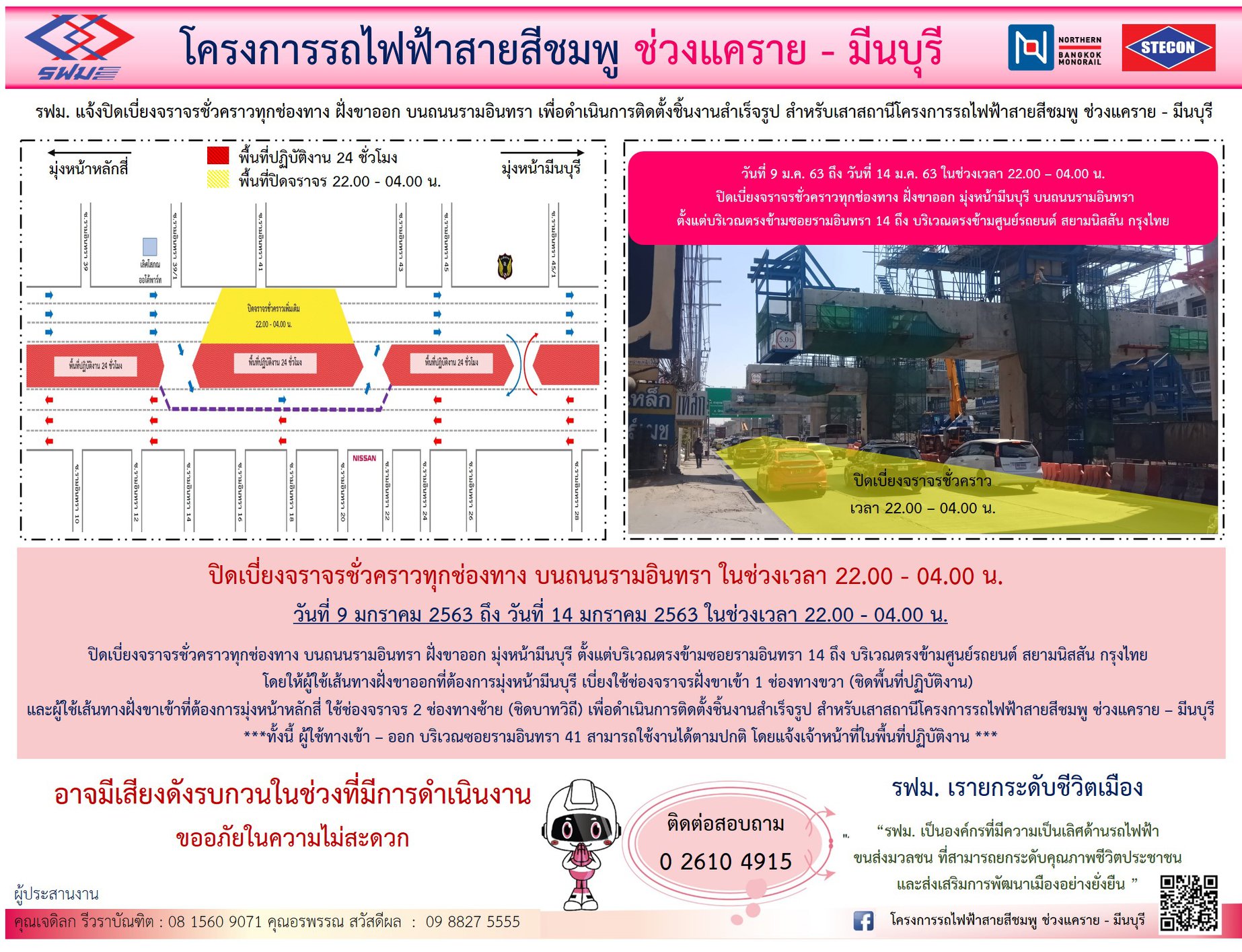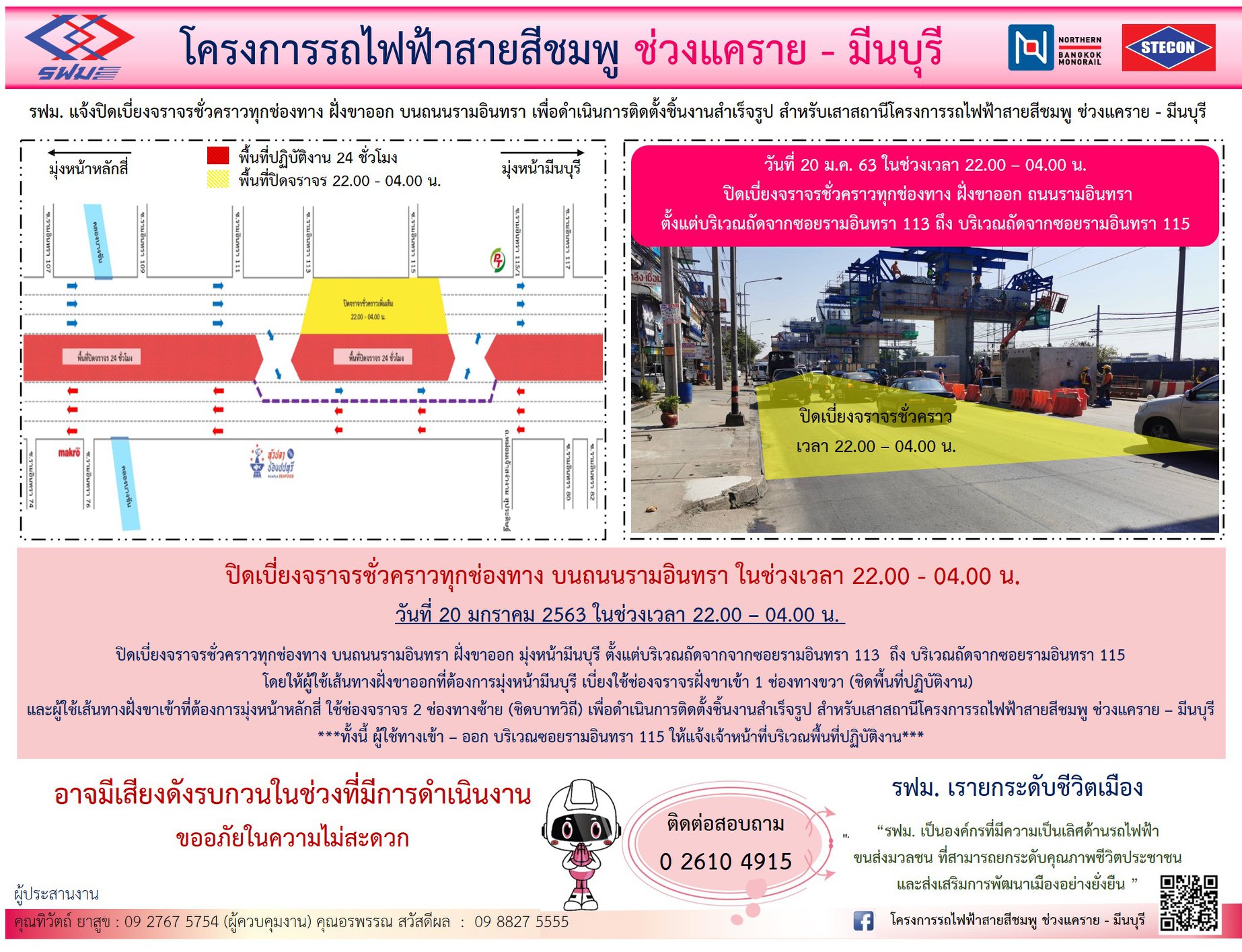 ปิดเบี่ยงจราจรชั่วคราวทุกช่องทาง บนถนนรามอินทรา ฝั่งขาเข้าและฝั่งขาออก เพื่อดำเนินการติดตั้งชิ้นงานสำเร็จรูป สำหรับเสาสถานี วันที่ 20 – 21 มกราคม 2563
