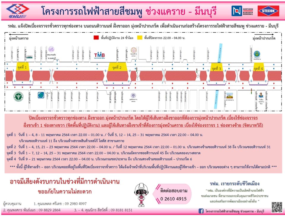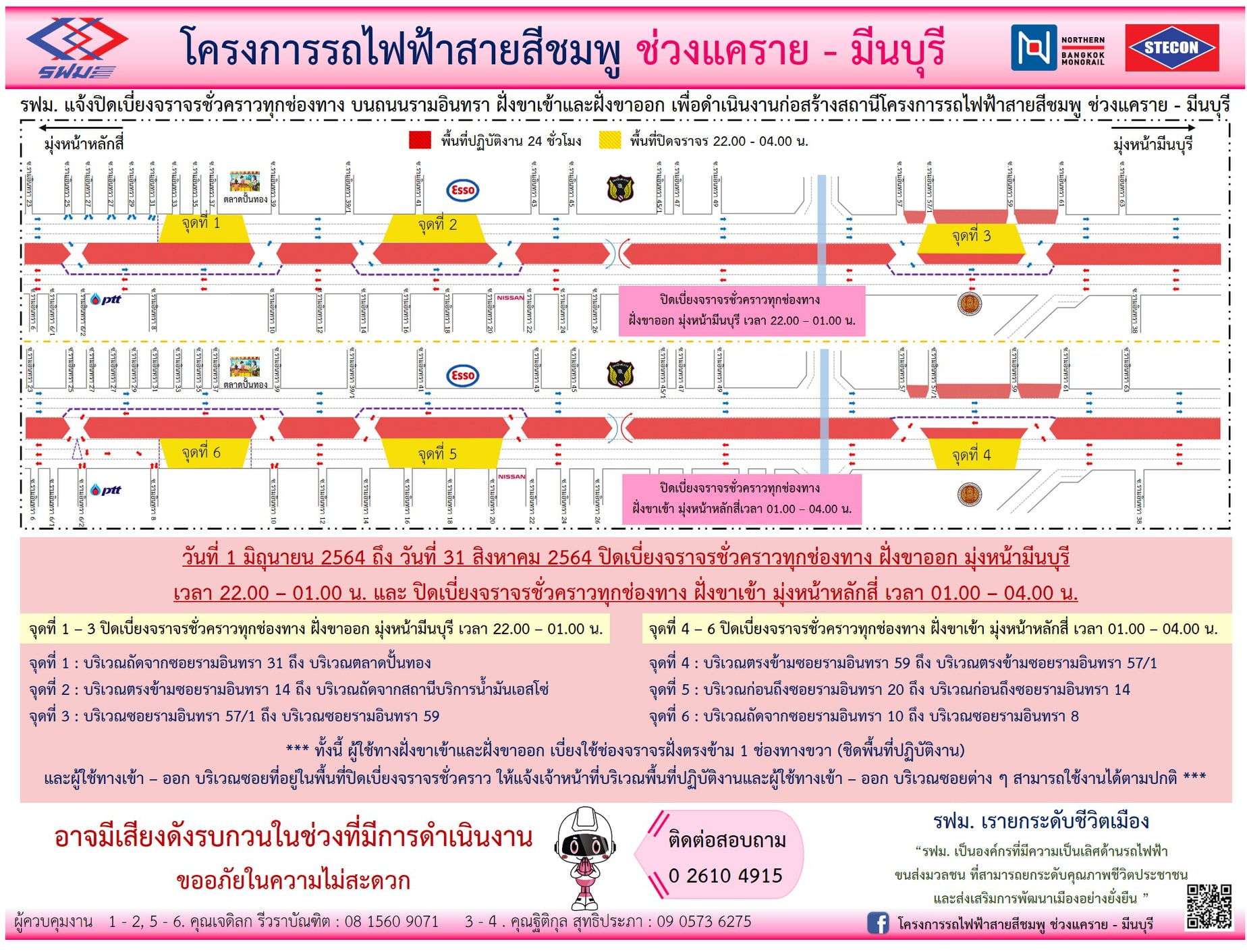 ปิดเบี่ยงจราจรและปิดเบี่ยงจราจรชั่วคราว บนถนนรามอินทรา ฝั่งขาออก มุ่งหน้ามีนบุรี บริเวณถัดจากซอยรามอินทรา 21 ถึง บริเวณถัดจากซอยรามอินทรา 23 วันที่ 21 พฤศจิกายน 2563 ถึง วันที่ 31 มีนาคม 2564 เพื่อดำเนินงานก่อสร้างสถานี