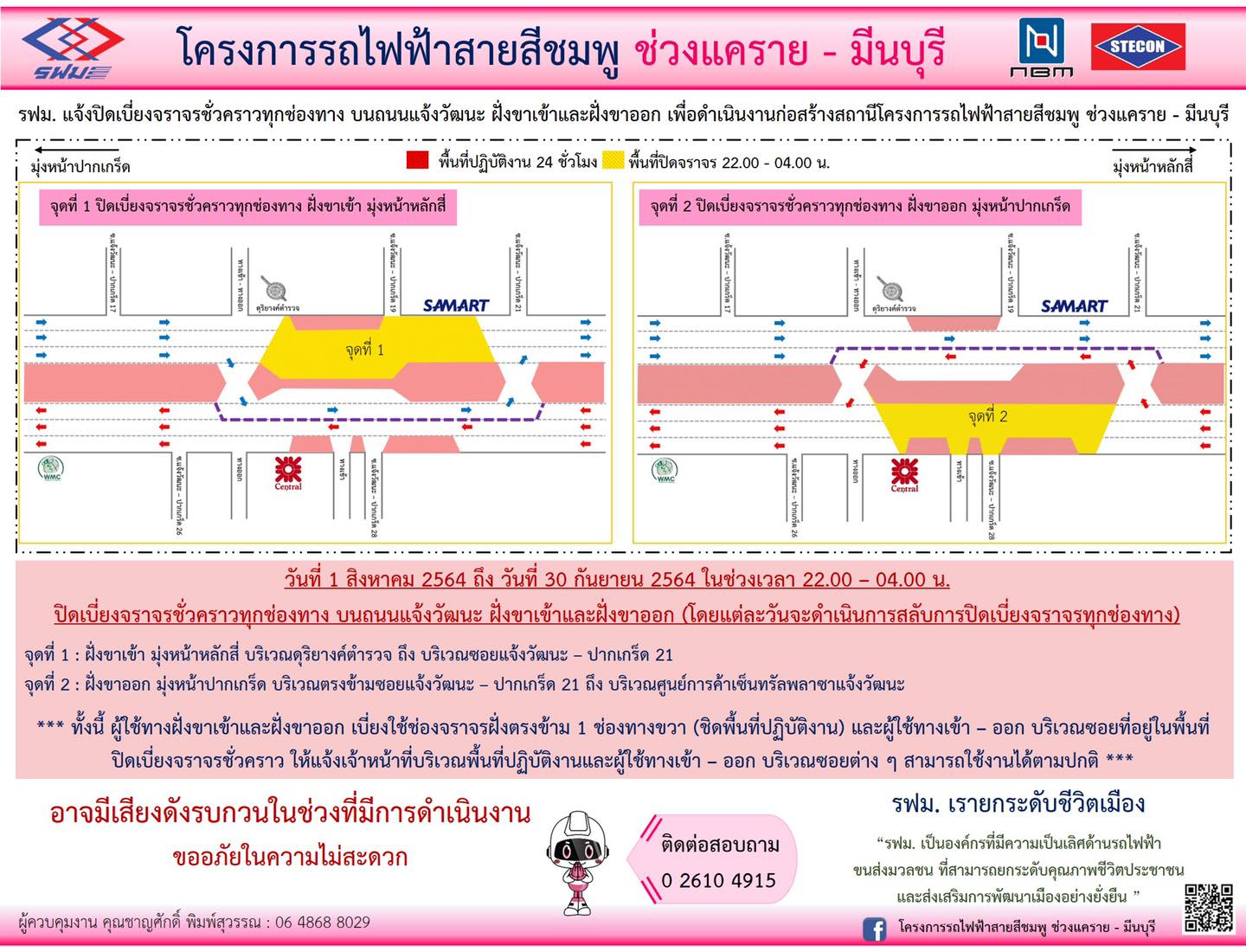 ปิดเบี่ยงจราจรชั่วคราวทุกช่องทาง บนถนนแจ้งวัฒนะ ฝั่งขาเข้าและฝั่งขาออก วันที่ 1 สิงหาคม 2564 ถึง วันที่ 30 กันยายน 2564 เวลา 22.00 – 04.00 น. เพื่อดำเนินงานก่อสร้างสถานี