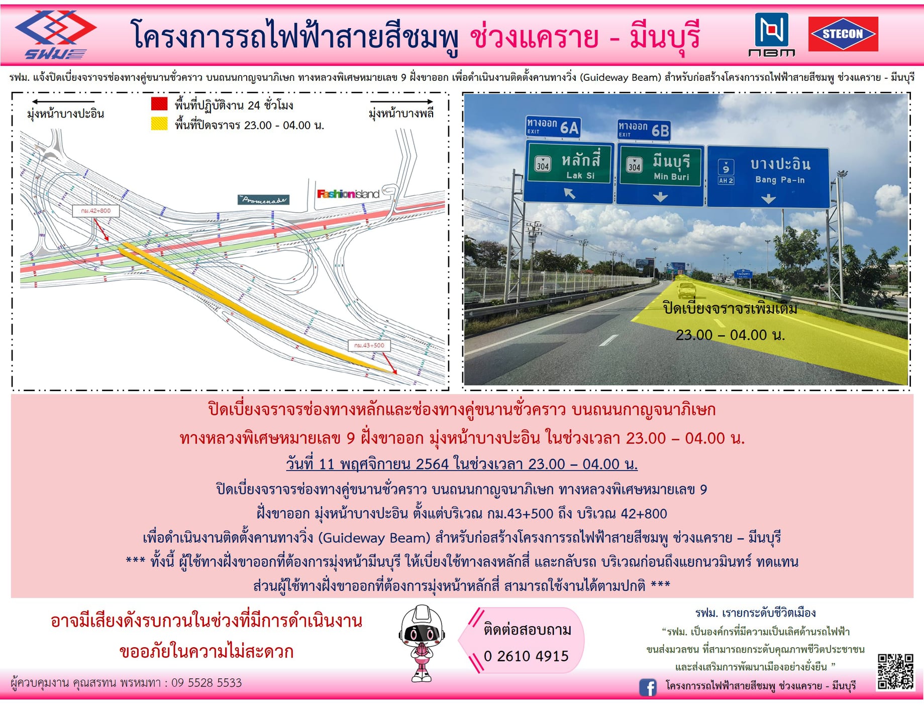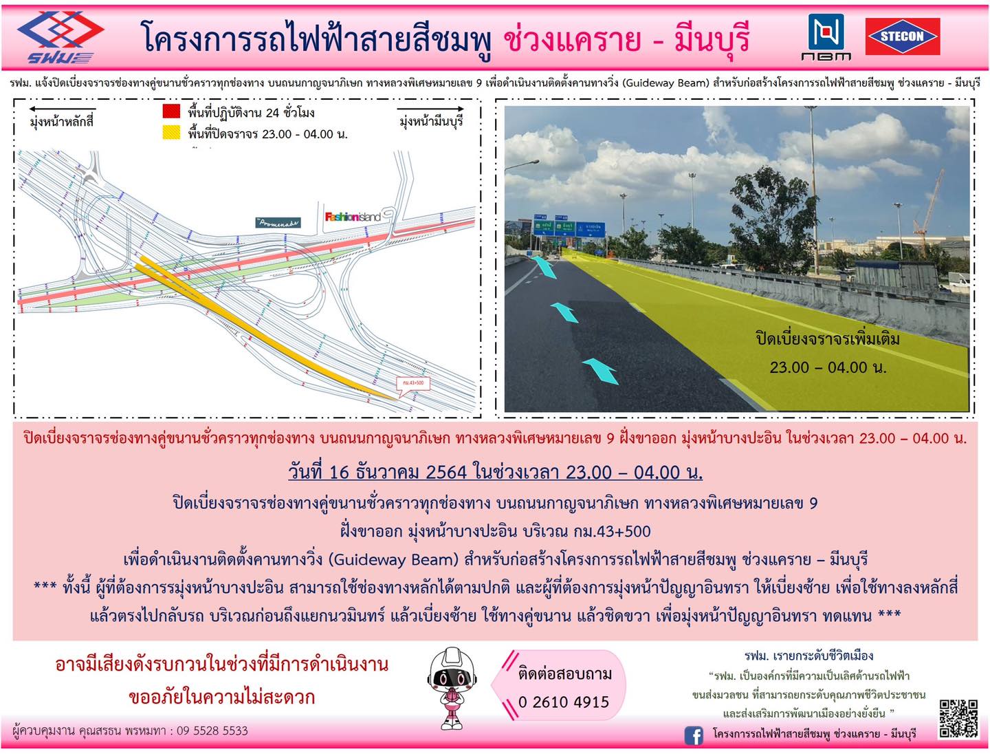 ปิดเบี่ยงจราจรและปิดพื้นที่เวนคืนชั่วคราว บนถนนรามอินทรา ฝั่งขาออก มุ่งหน้ามีนบุรี วันที่ 21 มิถุนายน 2565 เวลา 10.30 – 14.00 น. เพื่อดำเนินงานย้ายตำแหน่งเสาไฟฟ้า สำหรับก่อสร้างทางขึ้น – ลงสถานี
