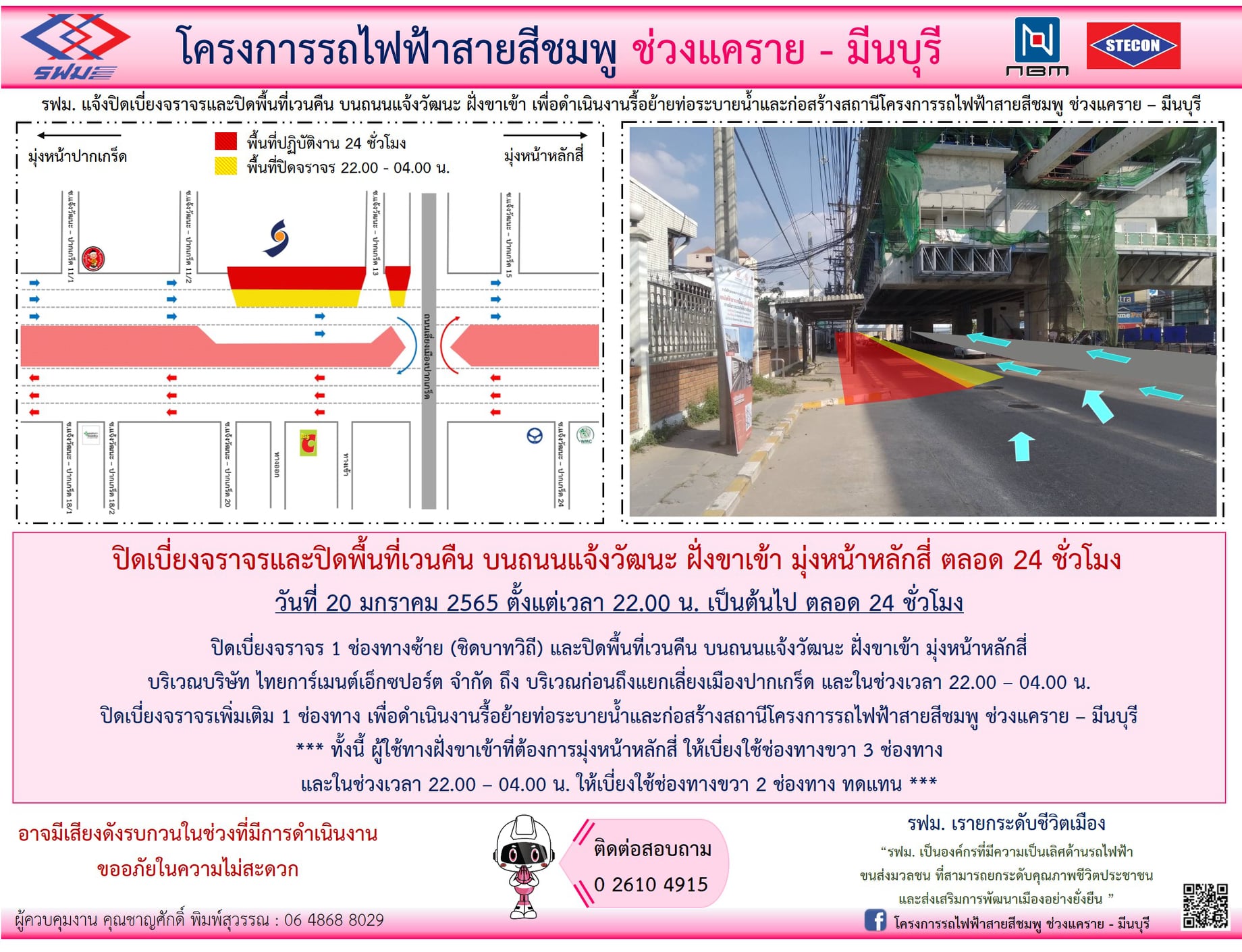 ปิดเบี่ยงจราจรและปิดพื้นที่เวนคืน บนถนนแจ้งวัฒนะ ฝั่งขาเข้า มุ่งหน้าหลักสี่ บริเวณบริษัท ไทยการ์เมนต์เอ็กซปอร์ต จำกัด ถึง บริเวณก่อนถึงแยกเลี่ยงเมืองปากเกร็ด วันที่ 20 มกราคม 2565 เวลา 22.00 น. เป็นต้นไป ตลอด 24 ชั่วโมง เพื่อดำเนินงานรื้อย้ายท่อระบายน้ำและก่อสร้างสถานี