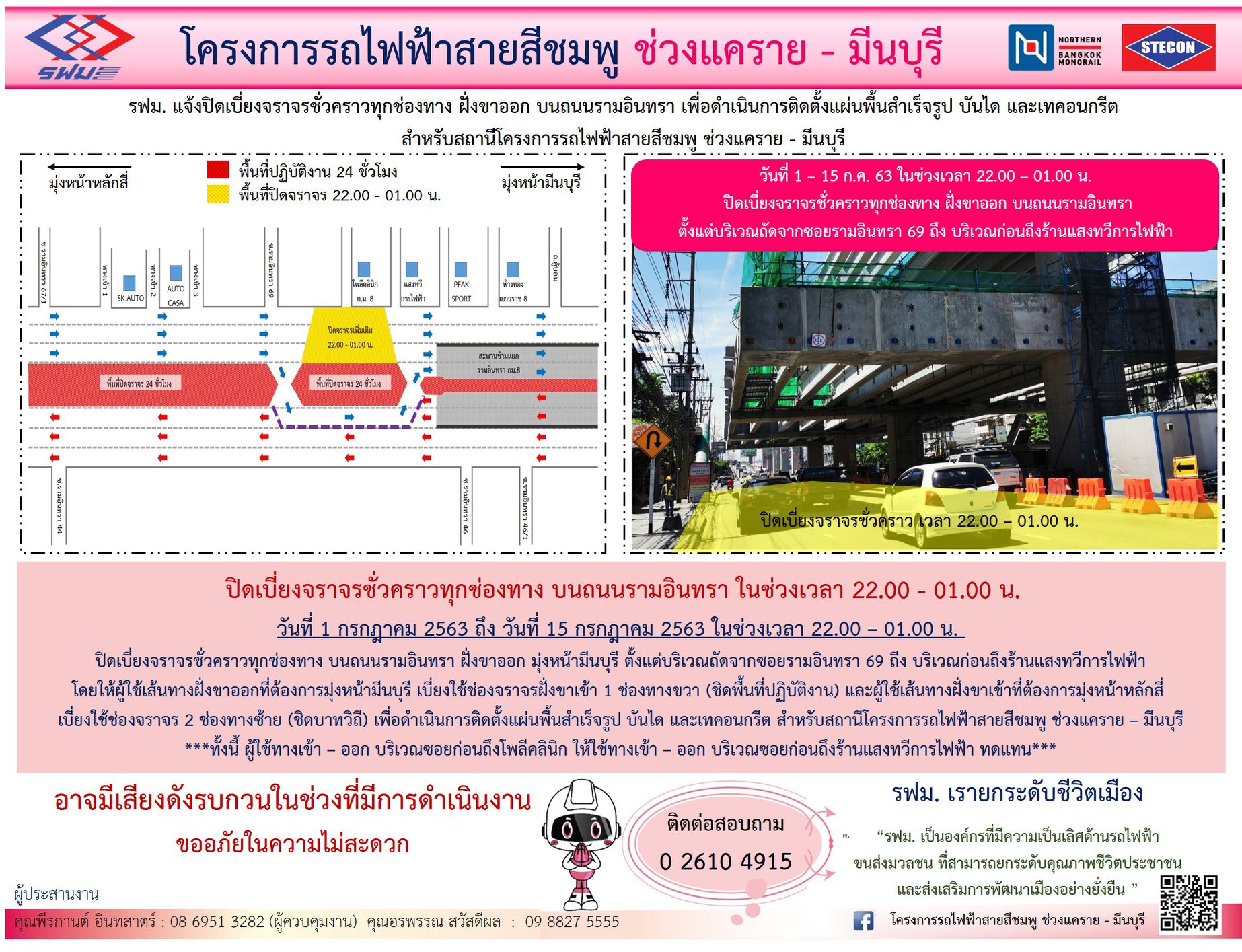 ปิดเบี่ยงจราจรชั่วคราวทุกช่องทาง บนถนนรามอินทรา ฝั่งขาเข้าและฝั่งขาออก ตั้งแต่บริเวณถัดจากซอยรามอินทรา 69 ถึง บริเวณก่อนถึงร้านแสงทวีการไฟฟ้า เพื่อดำเนินการติดตั้งแผ่นพื้นสำเร็จรูป บันได และเทคอนกรีต วันที่ 1 – 15 กรกฎาคม 2563 เวลา 22.00 – 04.00 น.