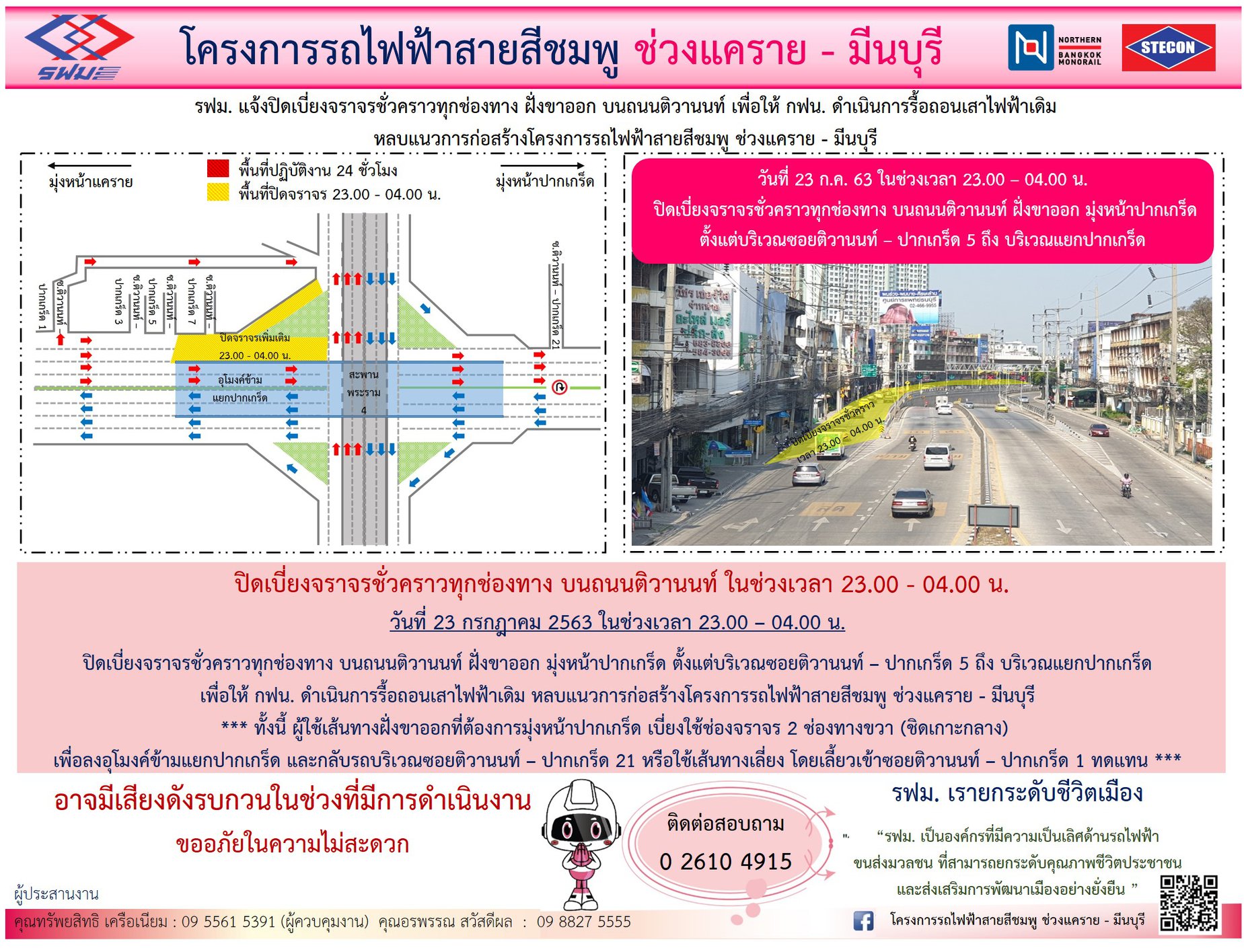 ปิดเบี่ยงจราจรชั่วคราวทุกช่องทาง บนถนนติวานนท์ ฝั่งขาออก มุ่งหน้าปากเกร็ด บริเวณซอยติวานนท์ – ปากเกร็ด 5 ถึง บริเวณแยกปากเกร็ด เพื่อให้ กฟน. ดำเนินการรื้อถอนเสาไฟฟ้าเดิม หลบแนวการก่อสร้าง วันที่ 23 กรกฎาคม 2563 เวลา 23.00 – 04.00 น.