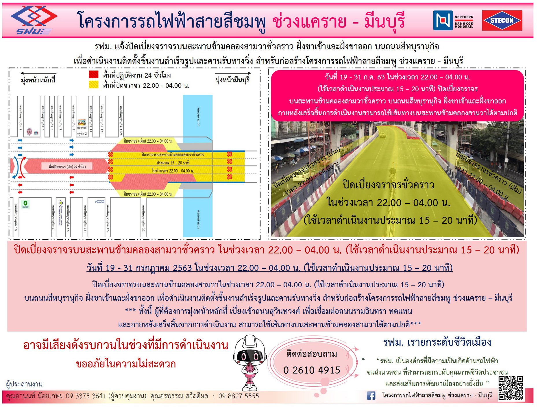 ปิดเบี่ยงจราจรบนสะพานข้ามคลองสามวาชั่วคราว บนถนนสีหบุรานุกิจ ฝั่งขาเข้าและฝั่งขาออก เพื่อดำเนินงานติดตั้งชิ้นงานสำเร็จรูปและคานรับทางวิ่ง วันที่ 19 – 31 กรกฎาคม 2563 เวลา 22.00 – 04.00 น. (ใช้เวลาดำเนินงานประมาณ 15 – 20 นาที)