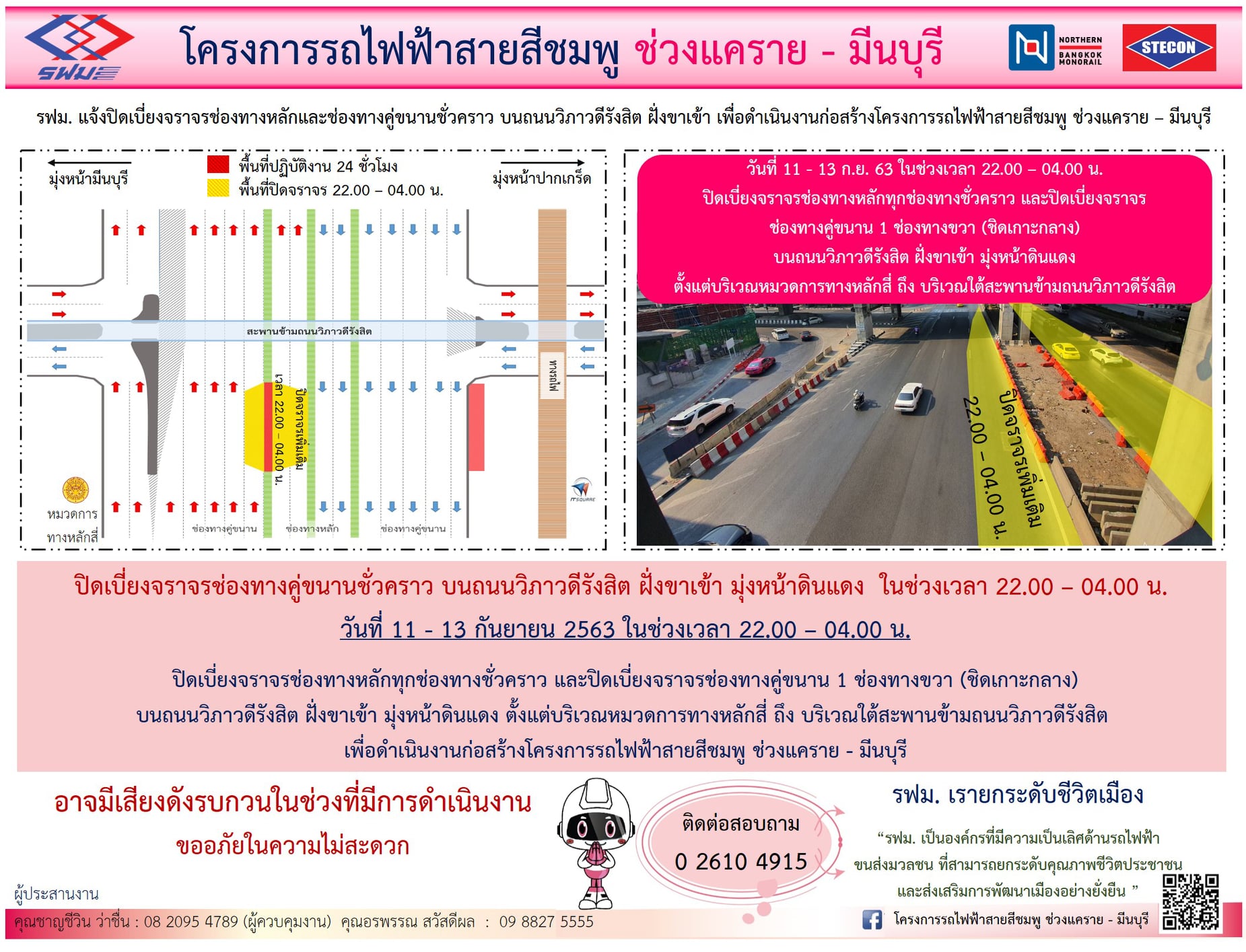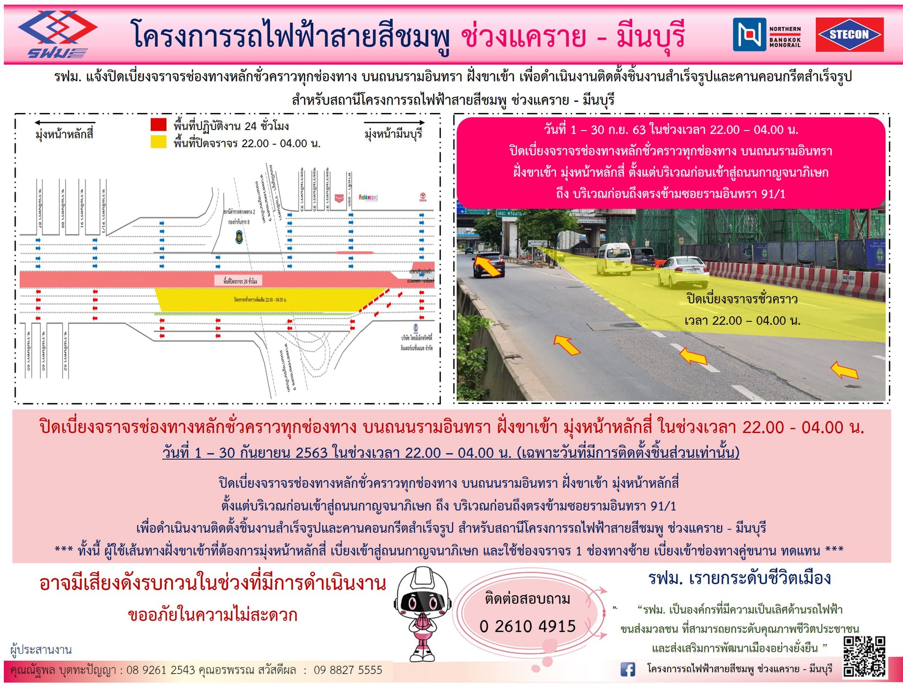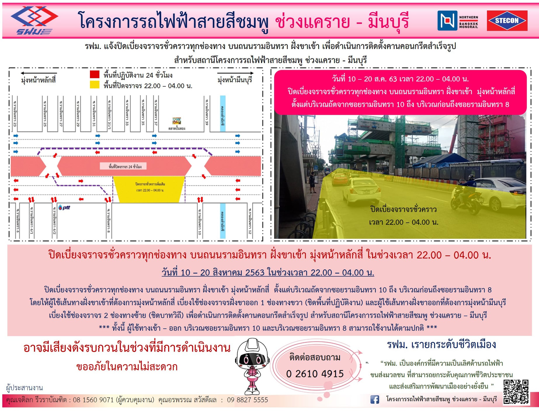 ปิดเบี่ยงจราจรชั่วคราวทุกช่องทาง บนถนนรามอินทรา ฝั่งขาเข้าและฝั่งขาออก บริเวณถัดจากซอยรามอินทรา 10 ถึง บริเวณก่อนถึงซอยรามอินทรา 8 เพื่อดำเนินการติดตั้งคานคอนกรีตสำเร็จรูป วันที่ 10 สิงหาคม 2563 ถึง วันที่ 5 กันยายน 2563 เวลา 22.00 – 04.00 น.