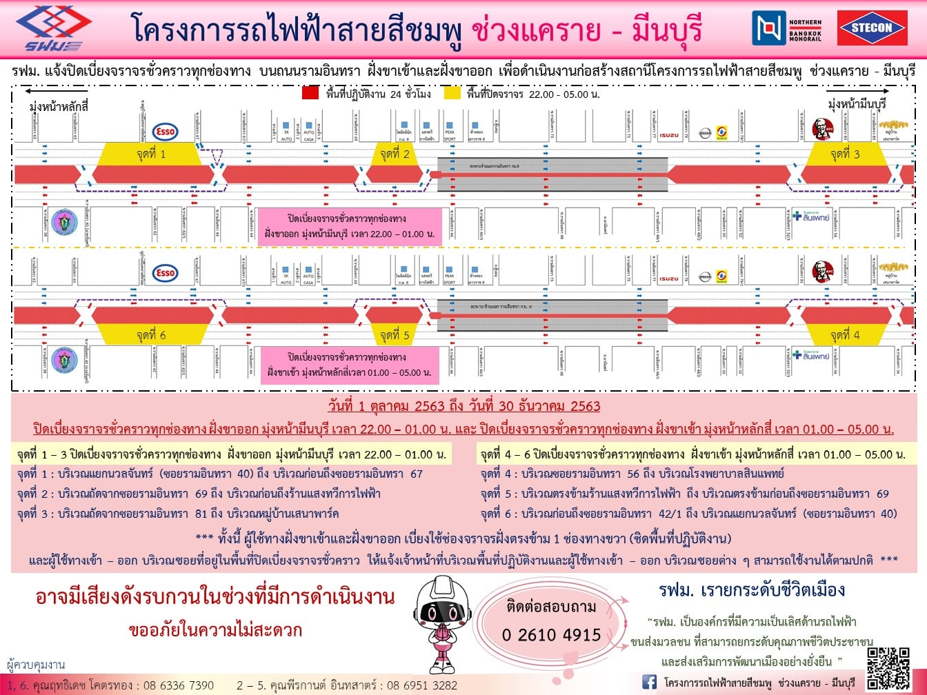 ปิดเบี่ยงจราจรชั่วคราวทุกช่องทาง บนถนนรามอินทรา ฝั่งขาเข้าและฝั่งขาออก บริเวณแยกนวลจันทร์ (ซอยรามอินทรา 40) ถึง บริเวณหมู่บ้านเสนาพาร์ค และ บริเวณซอยรามอินทรา 113 ถึง บริเวณซอยรามอินทรา 123 เพื่อดำเนินงานก่อสร้างสถานี วันที่ 1 ตุลาคม 2563 ถึง วันที่ 30 ธันวาคม 2563 เวลา 22.00 – 05.00 น.