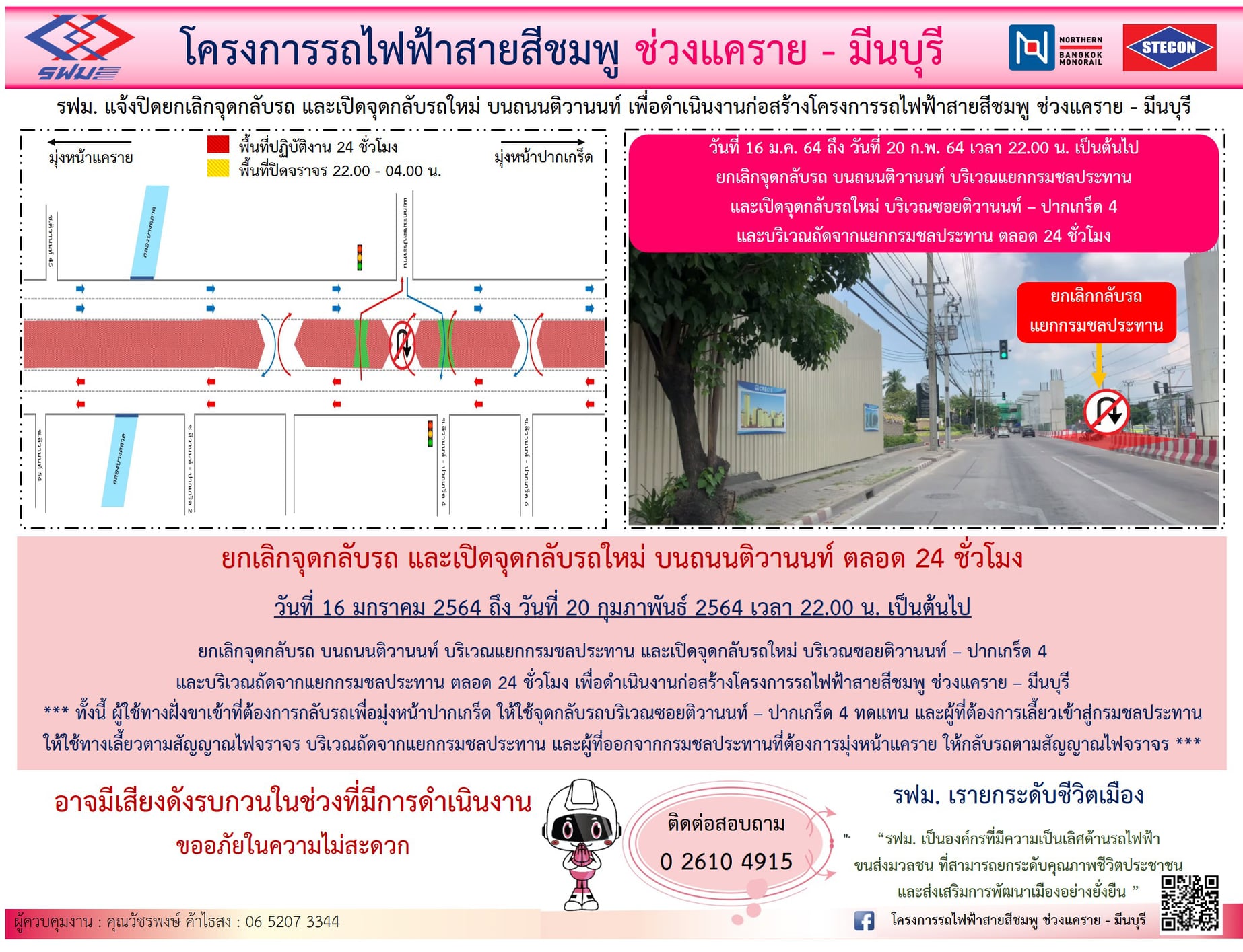 ยกเลิกจุดกลับรถและเปิดจุดกลับรถใหม่ บนถนนติวานนท์ บริเวณแยกกรมชลประทาน วันที่ 16 มกราคม 2564 ถึง วันที่ 20 กุมภาพันธ์ 2564 เวลา 22.00 น. เป็นต้นไป เพื่อดำเนินงานก่อสร้าง
