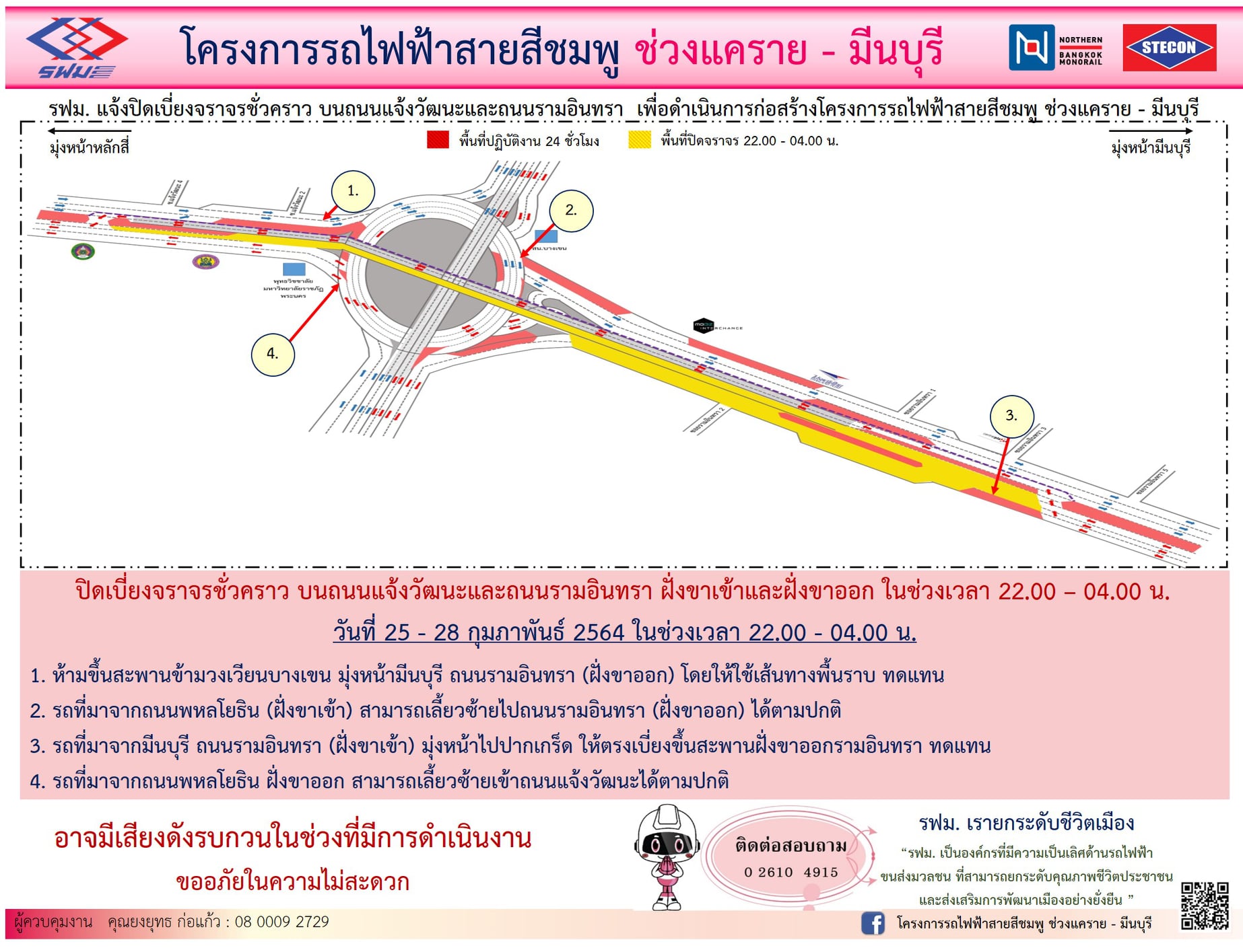 ปิดเบี่ยงจราจรชั่วคราวและยกเลิกจุดกลับรถชั่วคราว บนถนนแจ้งวัฒนะ ถนนรามอินทรา และถนนสีหบุรานุกิจ วันที่ 25 กุมภาพันธ์ 2564 ถึง วันที่ 15 มีนาคม 2564 เวลา 22.00 – 04.00 น.