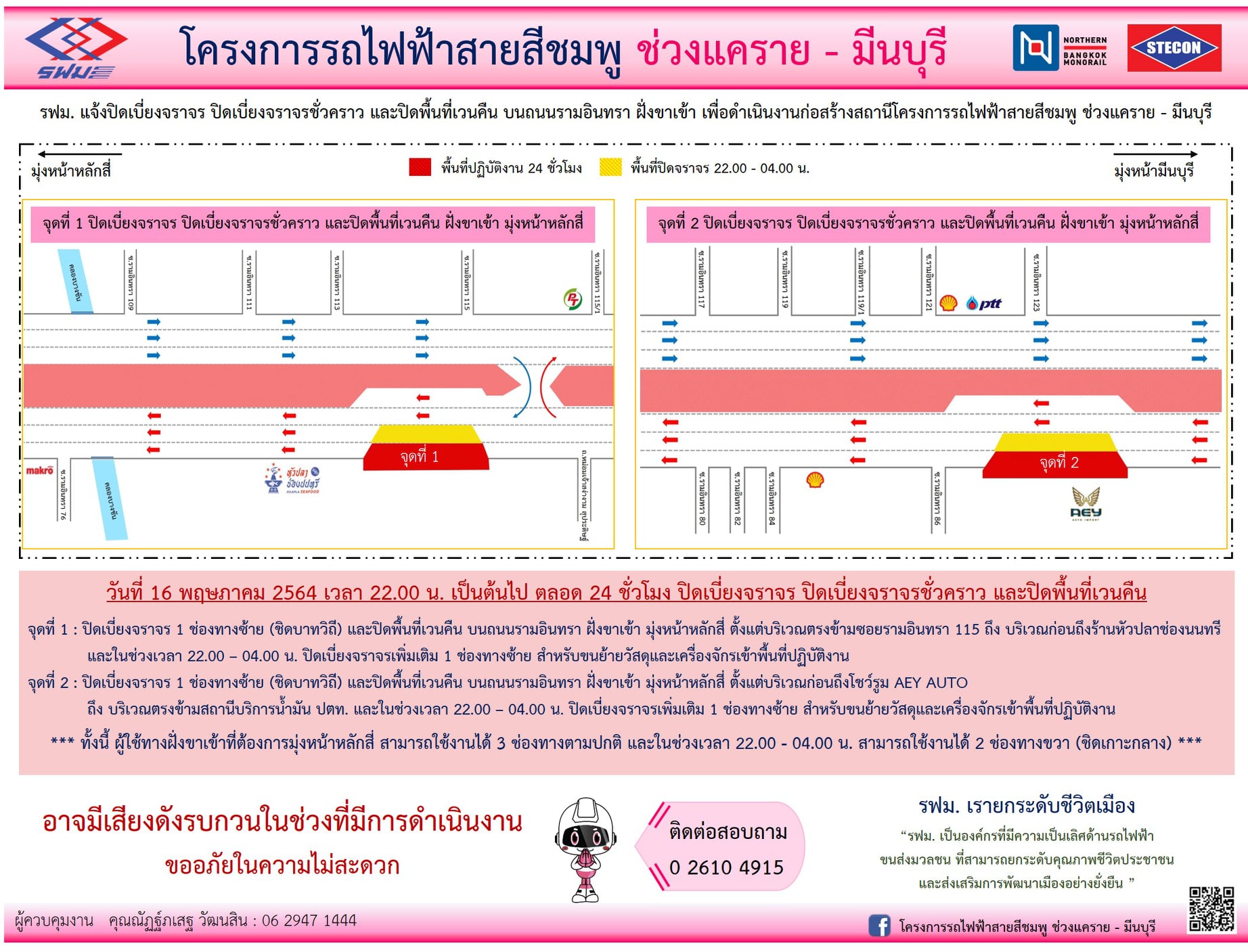 ปิดเบี่ยงจราจร ปิดเบี่ยงจราจรชั่วคราวและปิดพื้นที่เวนคืน บนถนนรามอินทรา ฝั่งขาเข้า มุ่งหน้าหลักสี่ บริเวณตรงข้ามซอยรามอินทรา 115 ถึง บริเวณก่อนถึงร้านหัวปลาช่องนนทรี และ บริเวณก่อนถึงโชว์รูม AEY AUTO ถึง บริเวณตรงข้ามสถานีบริการน้ำมัน ปตท. วันที่ 16 พฤษภาคม 2564 เวลา 22.00 น. เป็นต้นไป ตลอด 24 ชั่วโมง เพื่อดำเนินงานก่อสร้างสถานี