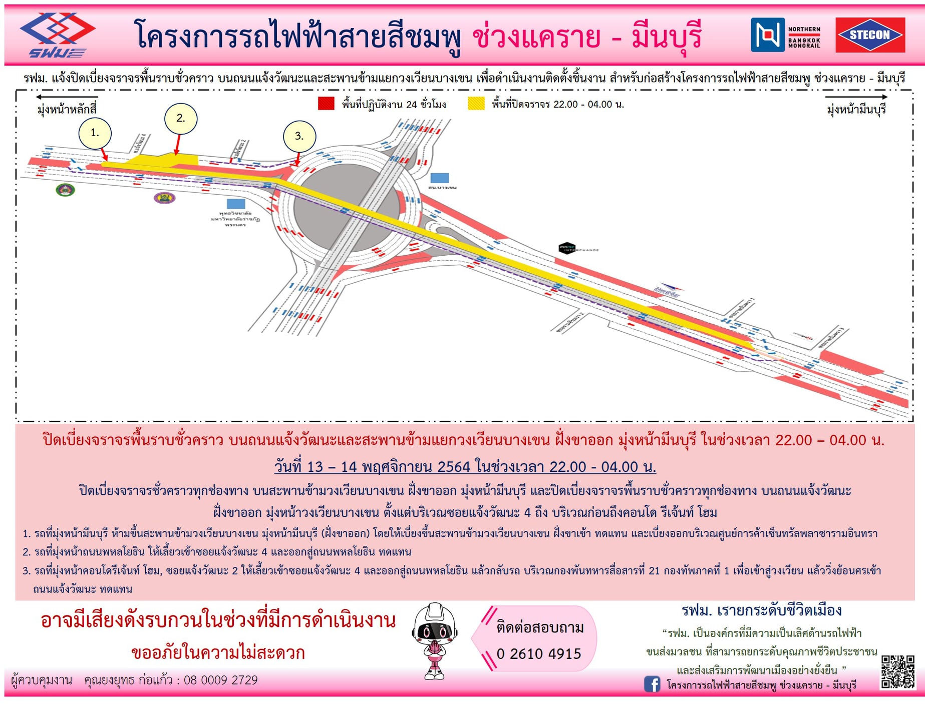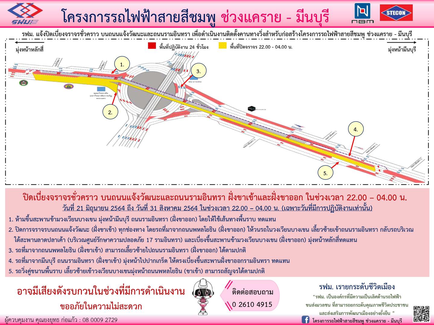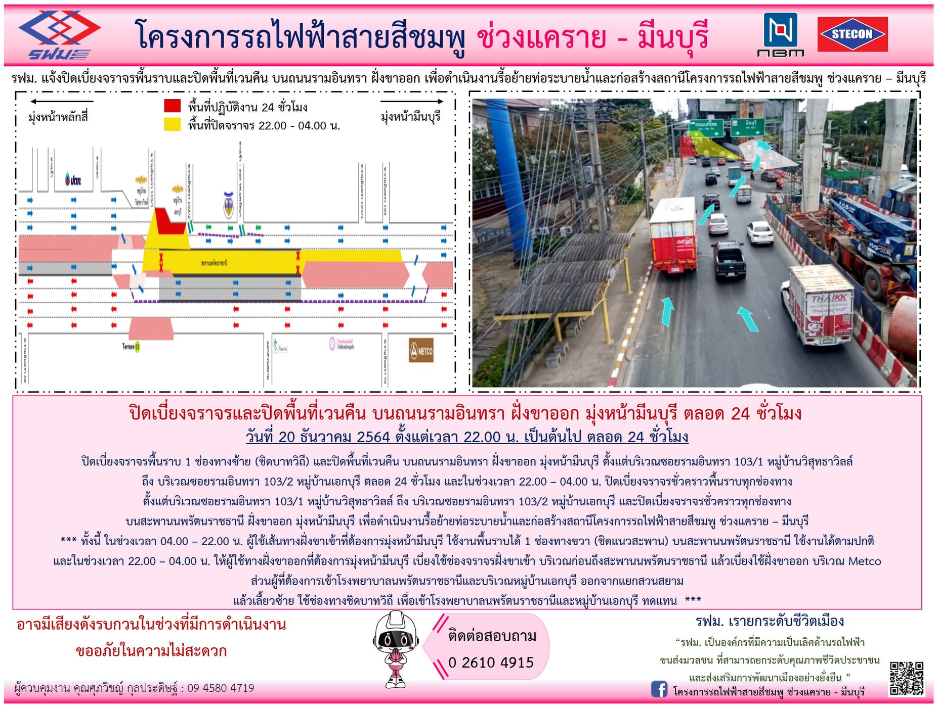 ปิดเบี่ยงจราจรพื้นราบและปิดพื้นที่เวนคืน บนถนนรามอินทรา ฝั่งขาออก มุ่งหน้ามีนบุรี บริเวณซอยรามอินทรา 130/1 หมู่บ้านวิสุทธาวิลล์ ถึง บริเวณซอยรามอินทรา 130/2 หมู่บ้านเอกบุรี วันที่ 20 ธันวาคม 2564 เวลา 22.00 น. เป็นต้นไป ตลอด 24 ชั่วโมง เพื่อดำเนินงานรื้อย้ายท่อระบายน้ำและก่อสร้างสถานี