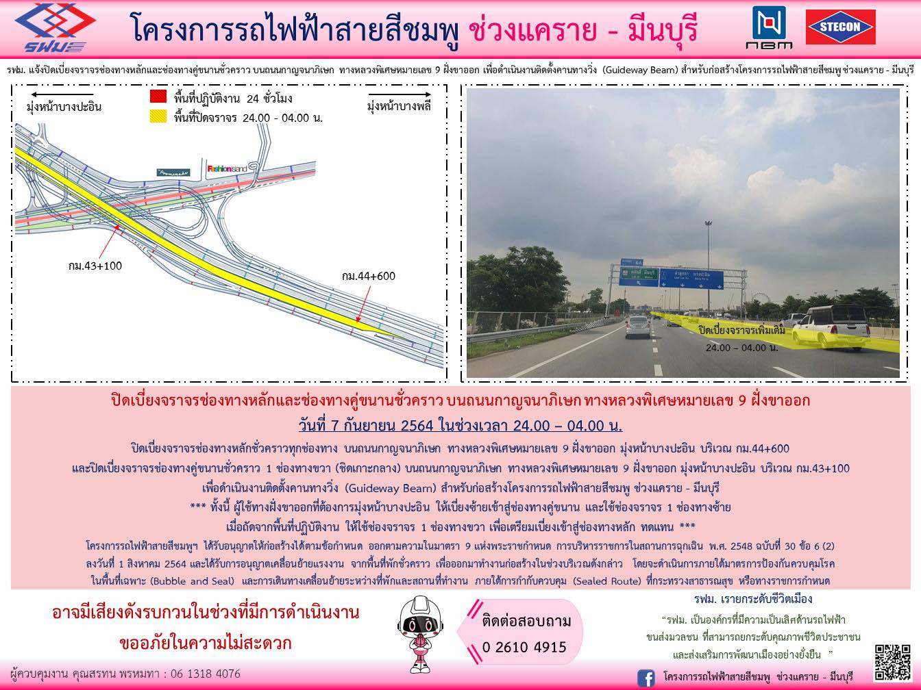 ปิดเบี่ยงจราจรช่องทางหลักและช่องทางคู่ขนานชั่วคราว บนถนนกาญจนาภิเษก ทางหลวงพิเศษหมายเลข 9 ฝั่งขาออก มุ่งหน้าบางปะอิน บริเวณ กม.44+600 และ บริเวณ 43+100 วันที่ 7 กันยายน 2564 เวลา 24.00 – 04.00 น. เพื่อดำเนินงานติดตั้งคานทางวิ่ง (Guideway Beam) สำหรับก่อสร้าง