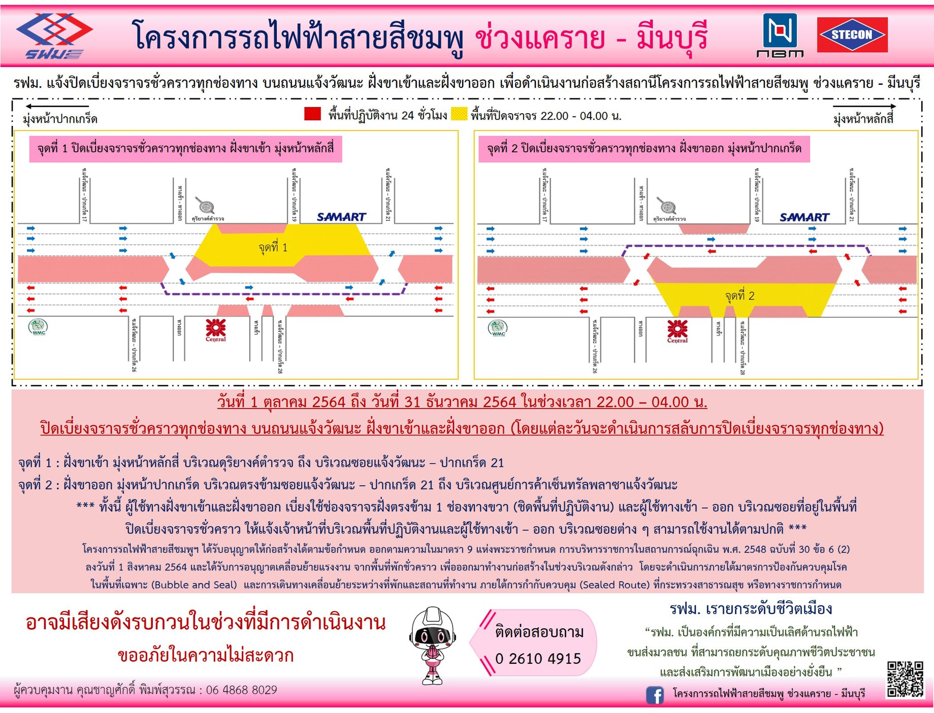 ปิดเบี่ยงจราจรชั่วคราวทุกช่องทาง บนถนนแจ้งวัฒนะ ฝั่งขาเข้าและฝั่งขาออก วันที่ 1 ตุลาคม 2564 ถึง วันที่ 31 ธันวาคม 2564 เวลา 22.00 – 04.00 น. เพื่อดำเนินงานก่อสร้างสถานี