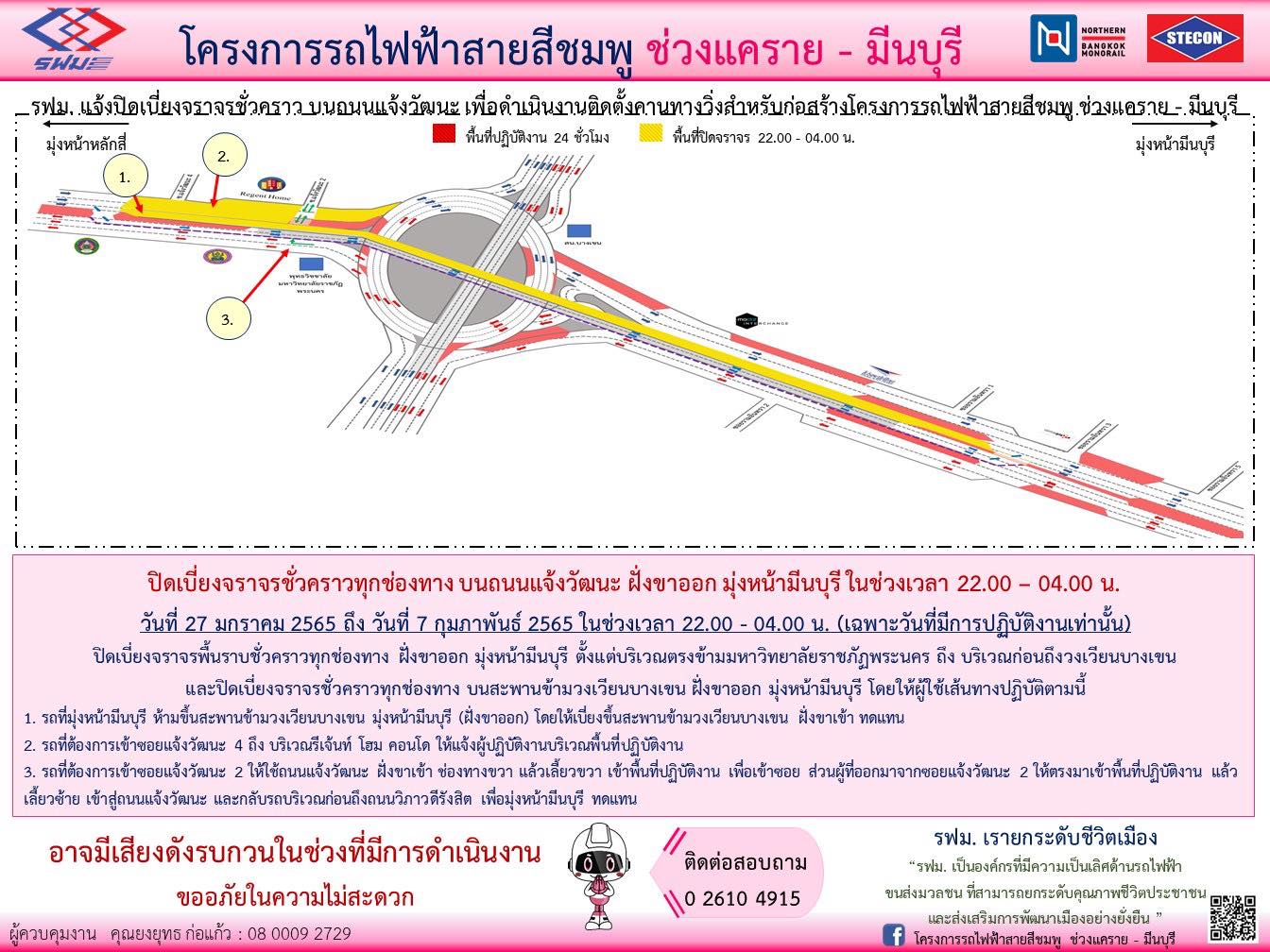 ปิดเบี่ยงจราจรชั่วคราวทุกช่องทาง บนถนนแจ้งวัฒนะ ฝั่งขาออก มุ่งหน้ามีนบุรี บริเวณตรงข้ามมหาวิทยาลัยราชภัฏพระนคร ถึง บริเวณก่อนถึงวงเวียนบางเขน และบนสะพานข้ามวงเวียนบางเขน ฝั่งขาออก มุ่งหน้ามีนบุรี วันที่ 27 มกราคม 2565 ถึง วันที่ 7 กุมภาพันธ์ 2565 เวลา 22.00 – 04.00 น. (เฉพาะวันที่มีการปฏิบัติงานเท่านั้น) เพื่อดำเนินงานติดตั้งคานทางวิ่ง