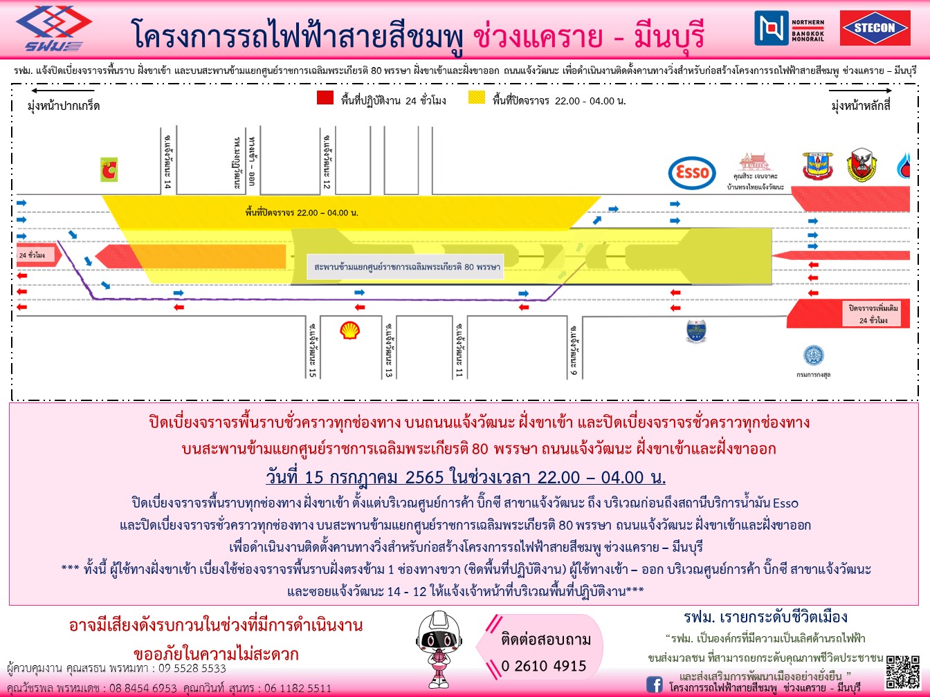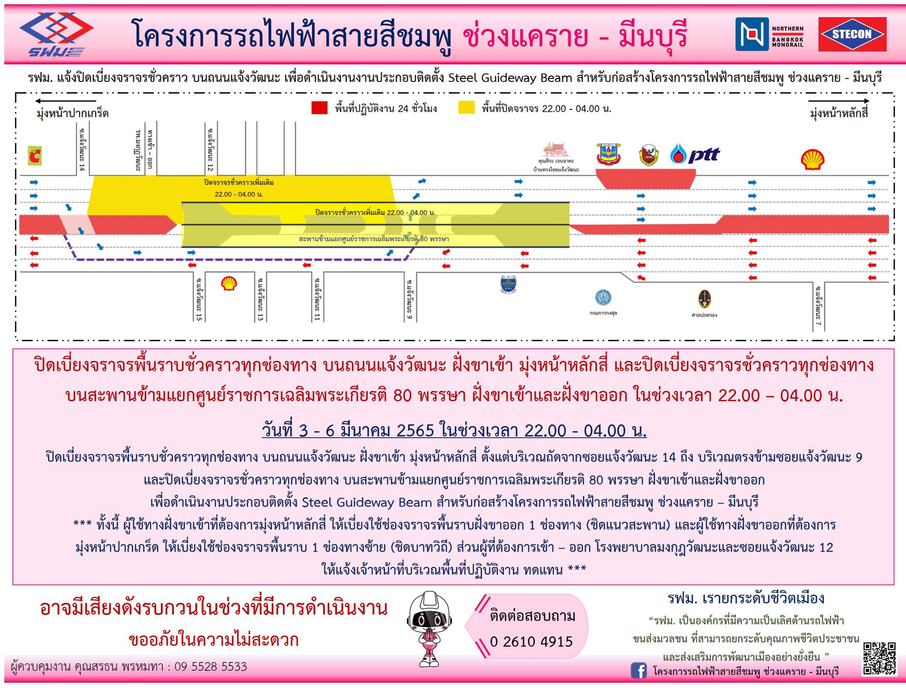 ปิดเบี่ยงจราจรพื้นราบชั่วคราวทุกช่องทาง บนถนนแจ้งวัฒนะ ฝั่งขาเข้าและฝั่งขาออก บริเวณถัดจากซอยแจ้งวัฒนะ 14 ถึง บริเวณตรงข้ามซอยแจ้งวัฒนะ 9 และบนสะพานข้ามแยกศูนย์ราชการเฉลิมพระเกียรติ 80 พรรษา วันที่ 3 – 10 มีนาคม 2565 เวลา 22.00 – 04.00 น. เพื่อดำเนินงานประกอบติดตั้ง Steel Guideway Beam