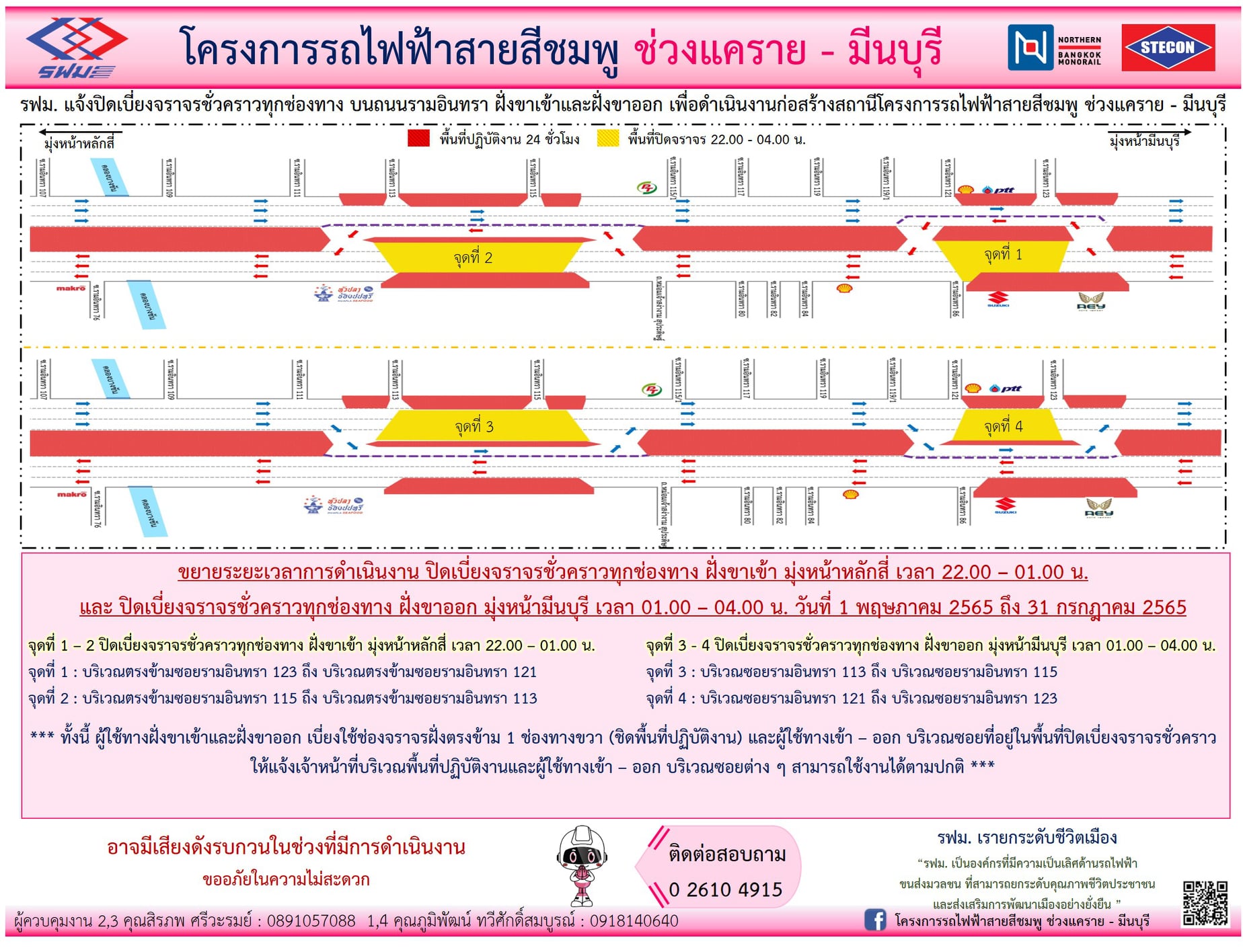 ขยายระยะเวลาการดำเนินงานปิดเบี่ยงจราจรชั่วคราวทุกช่องทางและปิดเบี่ยงจราจรชั่วคราว บนถนนรามอินทรา ฝั่งขาเข้าและฝั่งขาออก บริเวณซอยรามอินทรา 31 ถึง บริเวณซอยรามอินทรา 123 วันที่ 1 พฤษภาคม 2565 ถึง 31 กรกฎาคม 2565 เวลา 22.00 – 04.00 น.