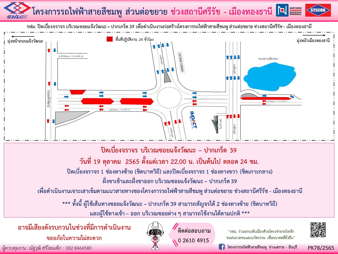 ปิดเบี่ยงจราจร 1 ช่องทางซ้าย (ชิดบาทวิถี) และปิดเบี่ยงจราจร 1 ช่องทางขวา (ชิดเกาะกลาง) ฝั่งขาเข้าและฝั่งขาออก บริเวณซอยแจ้งวัฒนะ – ปากเกร็ด 39 วันที่ 19 ตุลาคม 2565 เวลา 22.00 น. เป็นต้นไป ตลอด 24 ชั่วโมง เพื่อดำเนินงานก่อสร้างโครงการรถไฟฟ้าสายสีชมพู ส่วนต่อขยาย ช่วงสถานีศรีรัช – เมืองทองธานี
