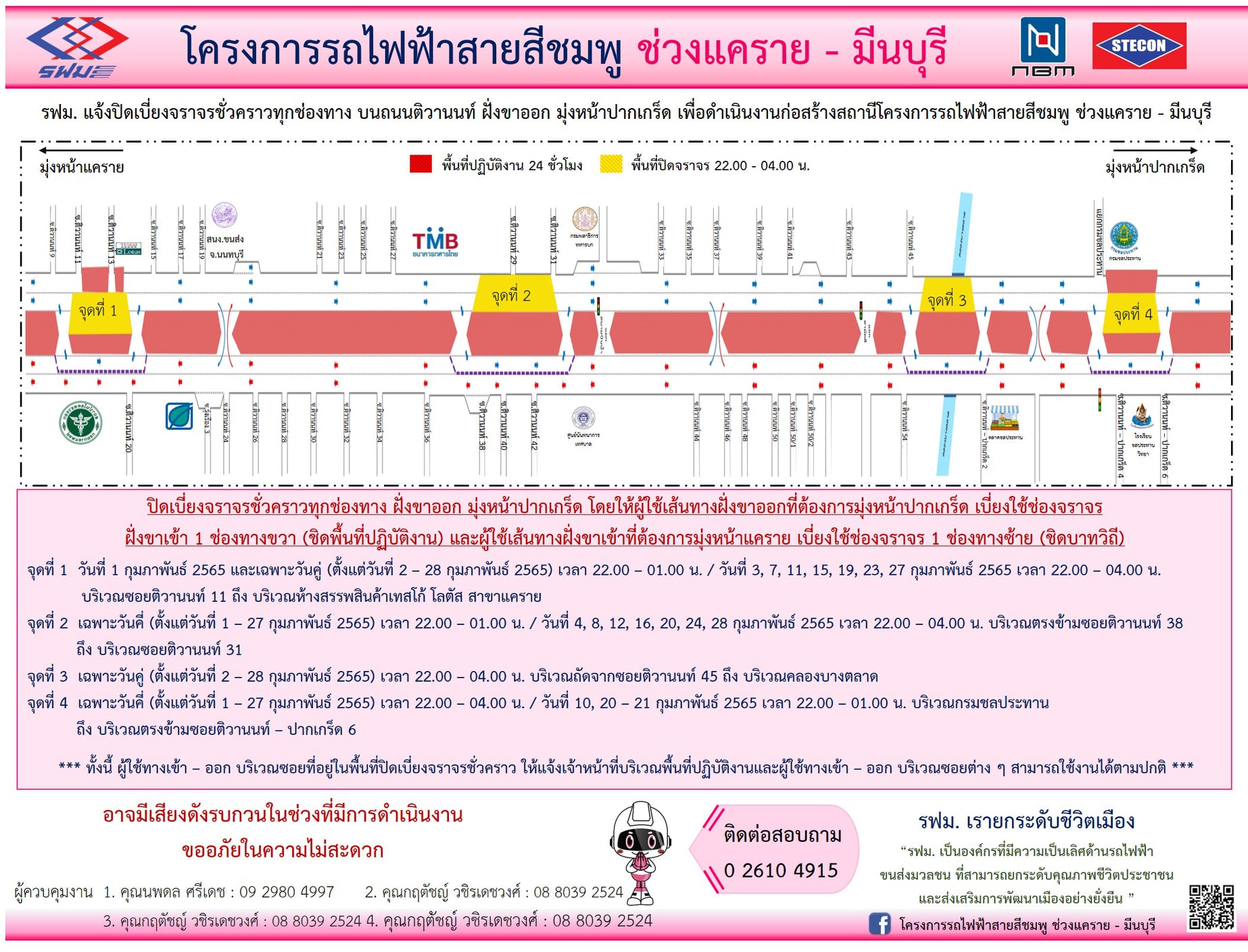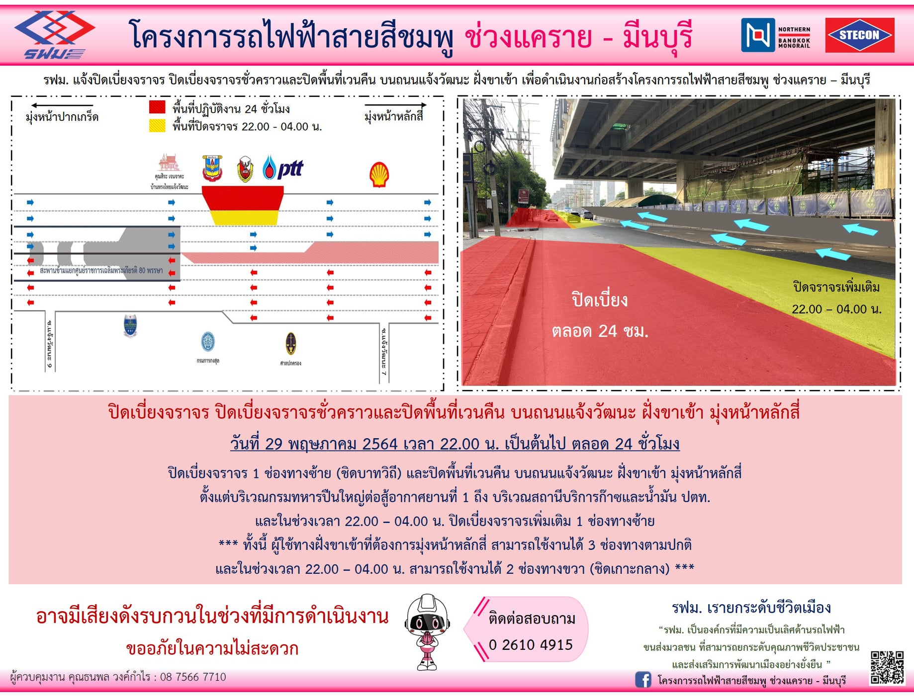 ปิดเบี่ยงจราจรและปิดเบี่ยงจราจรชั่วคราว บนถนนติวานนท์ ถนนแจ้งวัฒนะ และถนนรามอินทรา วันที่ 15 มกราคม 2564 ถึง วันที่ 31 ตุลาคม 2565 เพื่อดำเนินงานก่อสร้าง