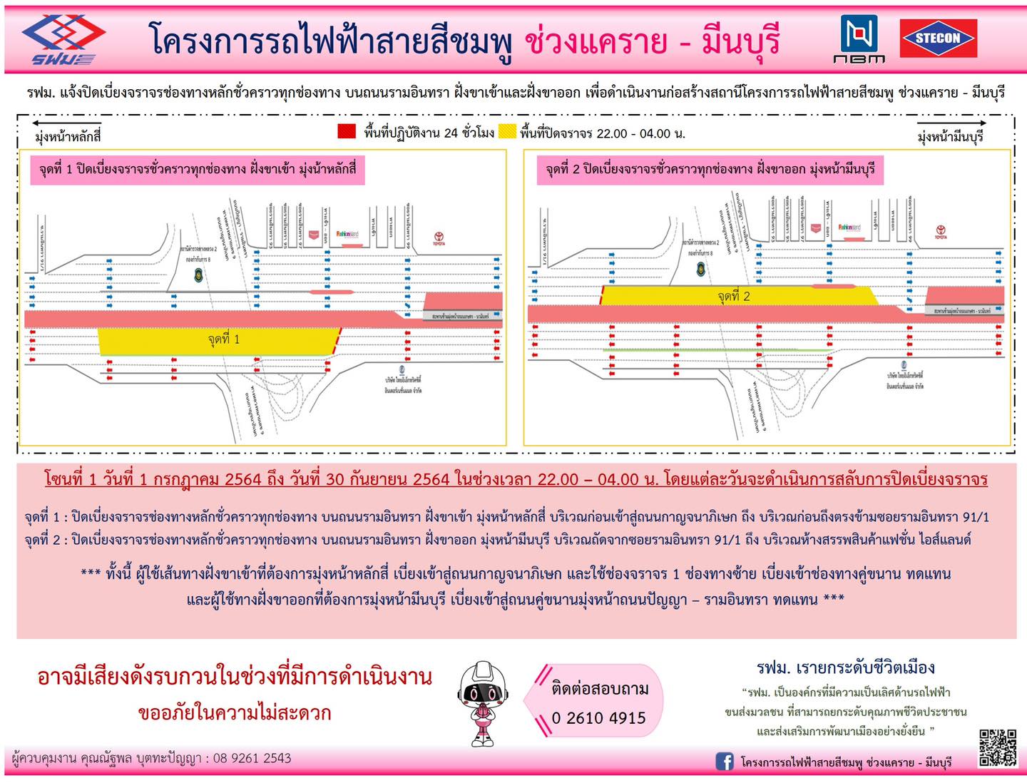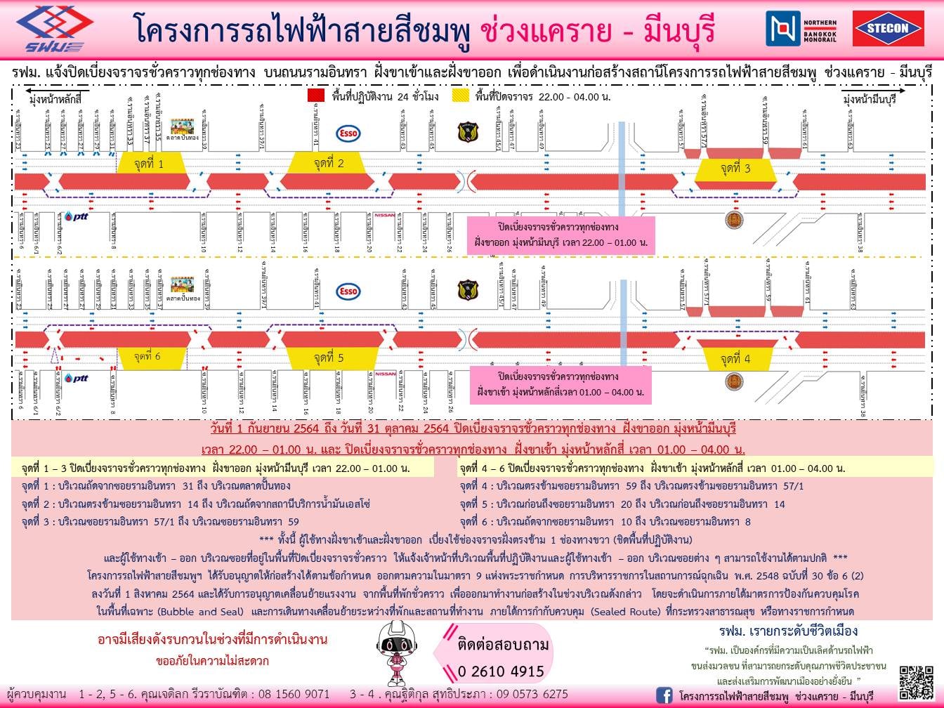 ปิดเบี่ยงจราจรชั่วคราวทุกช่องทาง บนถนนรามอินทรา ฝั่งขาเข้าและฝั่งขาออก บริเวณถัดจากซอยรามอินทรา 31 ถึง บริเวณหมู่บ้านเสนาพาร์ค วันที่ 1 กันยายน 2564 ถึง วันที่ 31 ตุลาคม 2564 เวลา 22.00 – 04.00 น. เพื่อดำเนินงานก่อสร้างสถานี