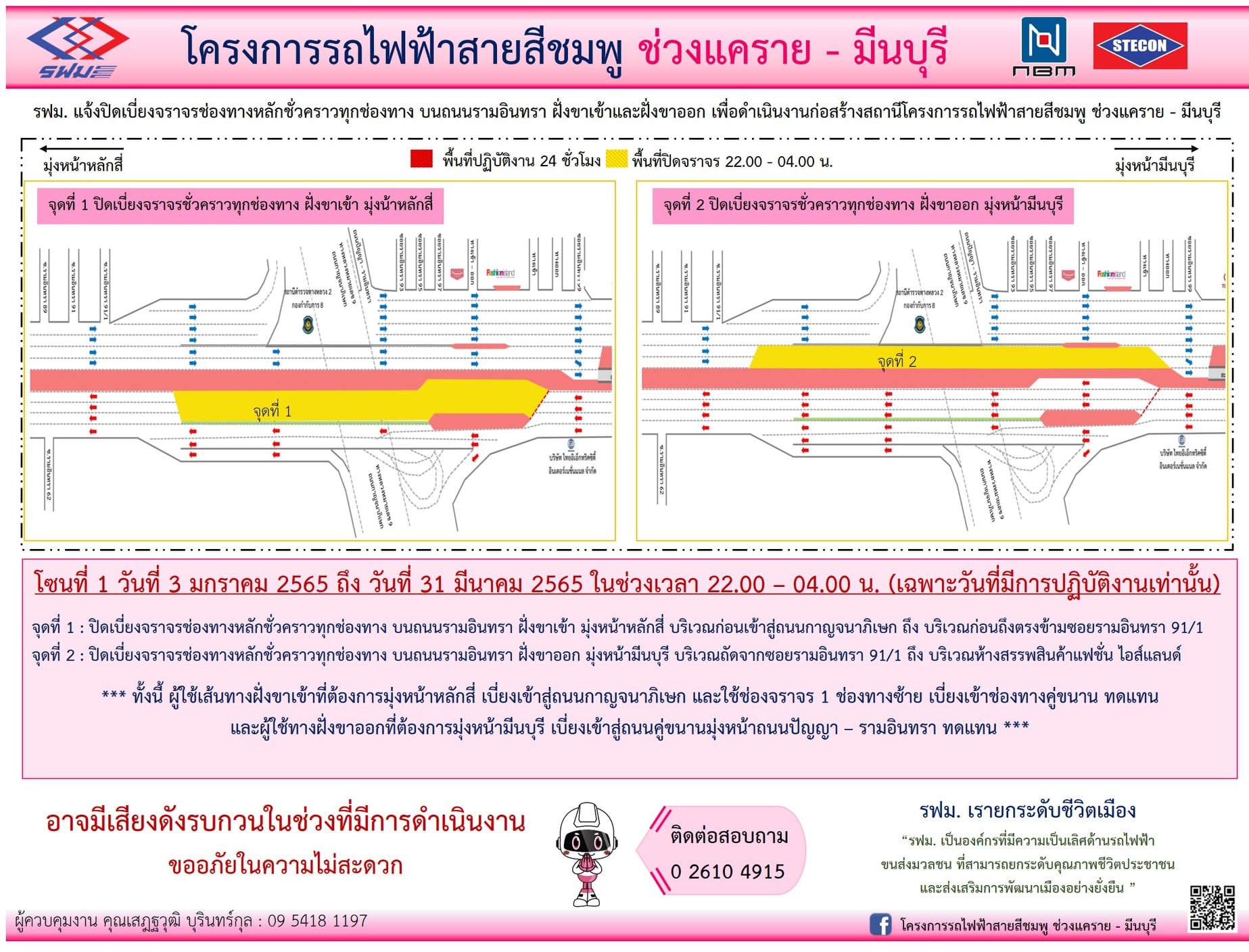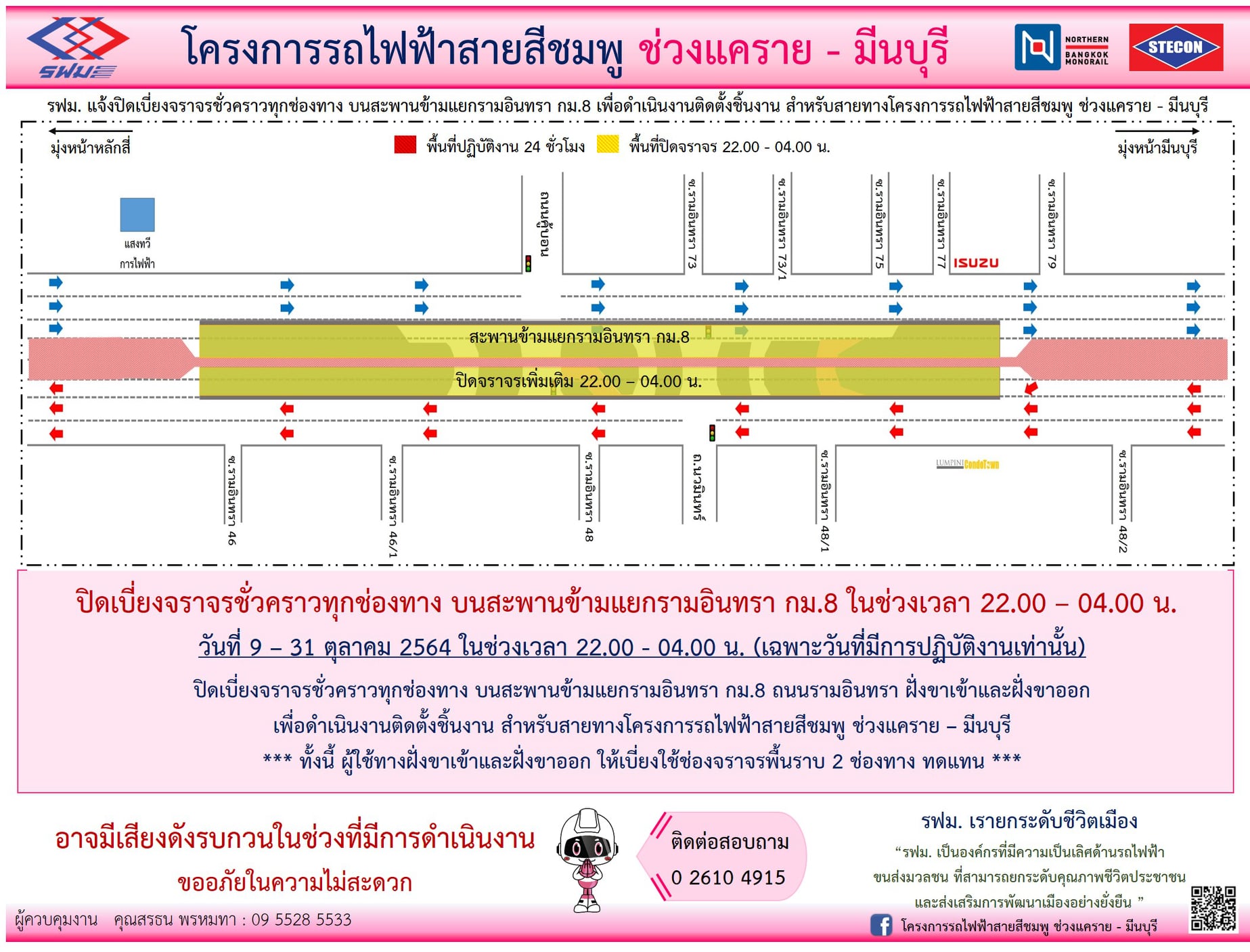 แจ้งปิดเบี่ยงจราจรชั่วคราวทุกช่องทาง บนถนนรามอินทรา ฝั่งขาเข้าและฝั่งขาออก และบนสะพานนพรัตนราชธานี วันที่ 3 มกราคม 2565 ถึง วันที่ 31 มีนาคม 2565 เวลา 22.00 – 04.00 น. (เฉพาะวันที่มีการปฏิบัติงานเท่านั้น) เพื่อดำเนินงานก่อสร้างสถานี