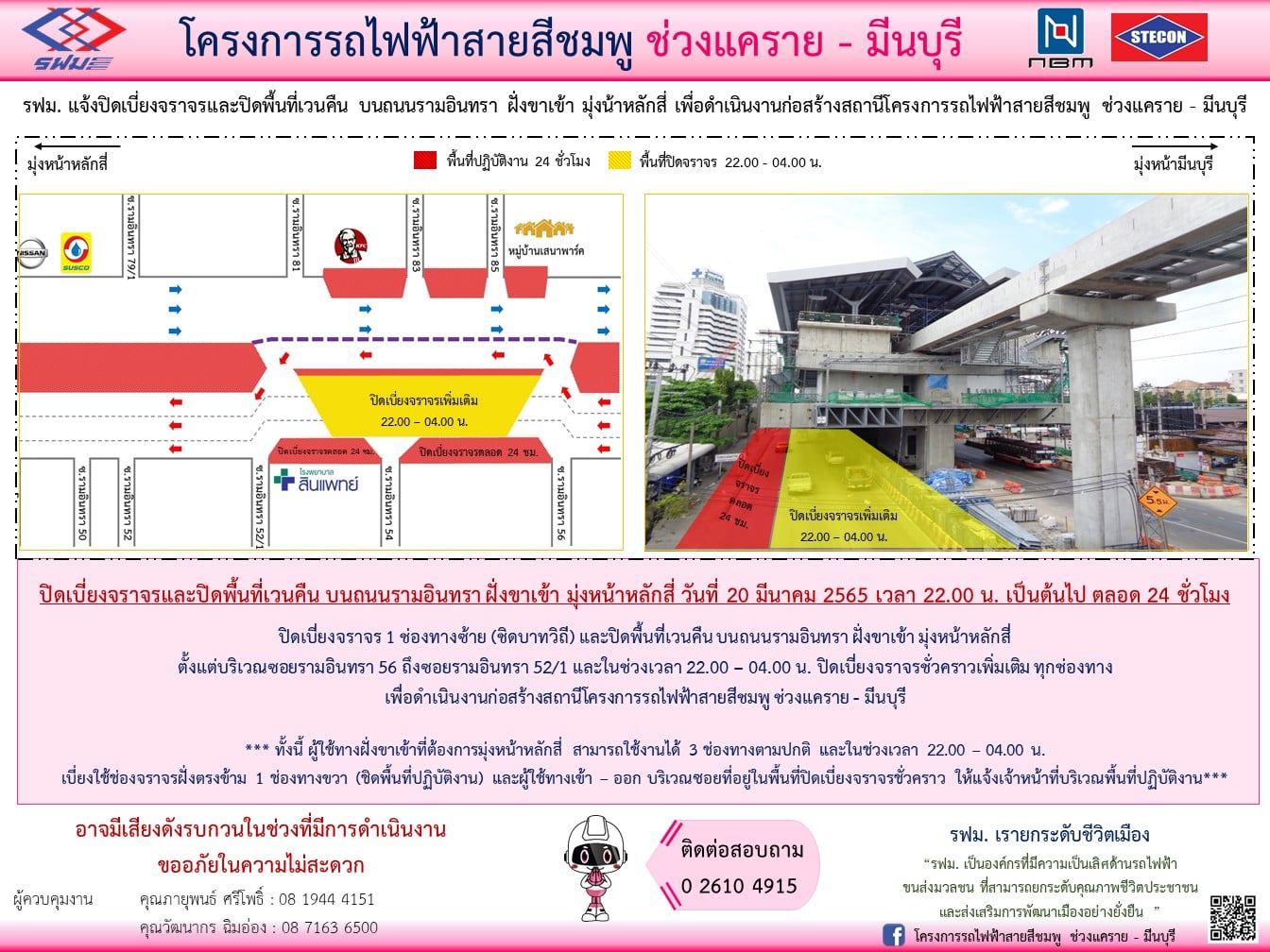 ปิดเบี่ยงจราจรและปิดพื้นที่เวนคืน บนถนนรามอินทรา ฝั่งขาเข้า มุ่งหน้าหลักสี่ บริเวณซอยรามอินทรา 56 ถึง ซอยรามอินทรา 52/1 วันที่ 20 มีนาคม 2565 เวลา 22.00 น. เป็นต้นไป ตลอด 24 ชั่วโมง เพื่อดำเนินงานรื้อย้ายท่อระบายน้ำและก่อสร้างสถานี
