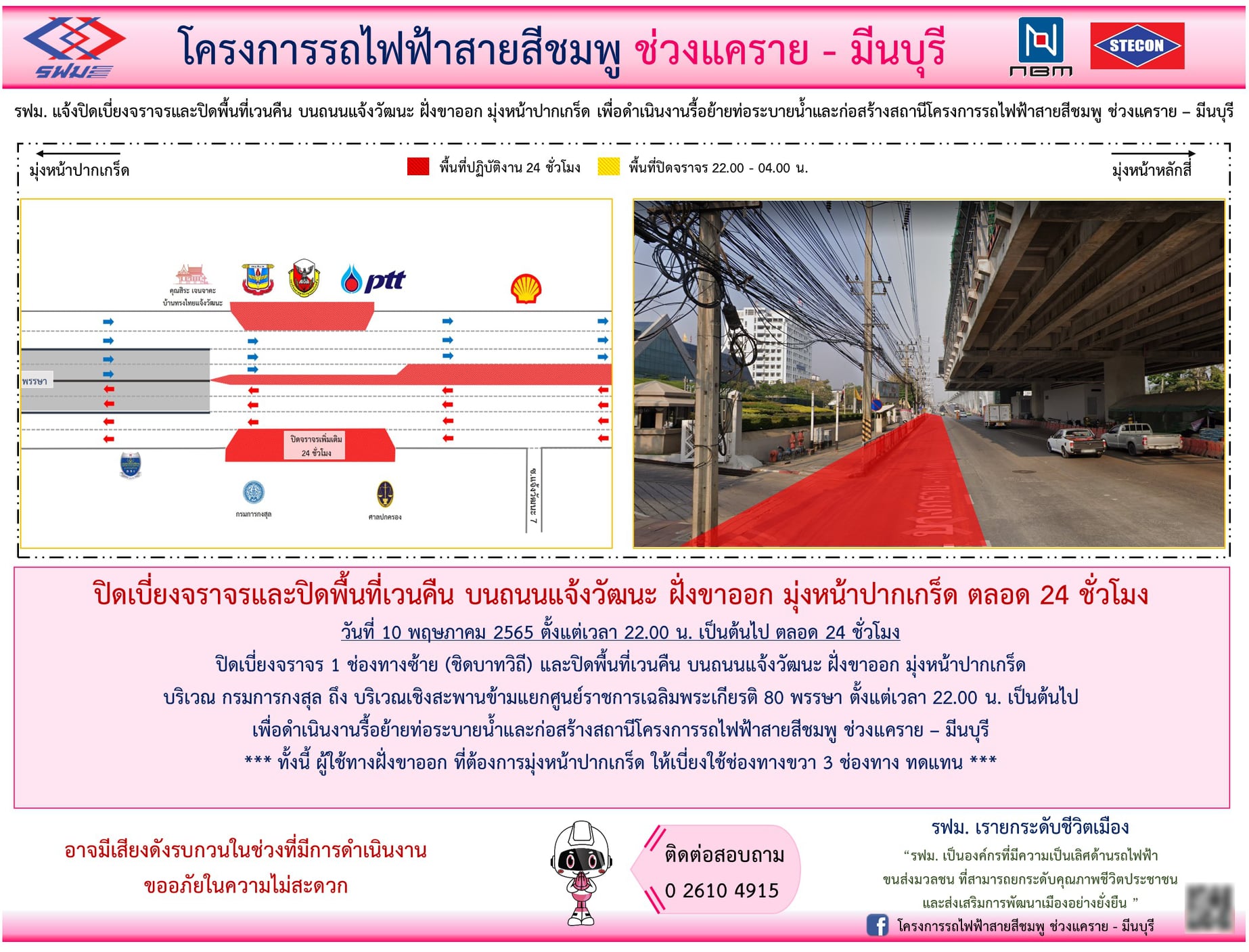 ปิดเบี่ยงจราจรและปิดพื้นที่เวนคืน บนถนนแจ้งวัฒนะ ฝั่งขาออก มุ่งหน้าปากเกร็ด วันที่ 10 พฤษภาคม 2565 ตั้งแต่เวลา 22.00 น. เป็นต้นไป ตลอด 24 ชั่วโมง เพื่อดำเนินงานก่อสร้าง