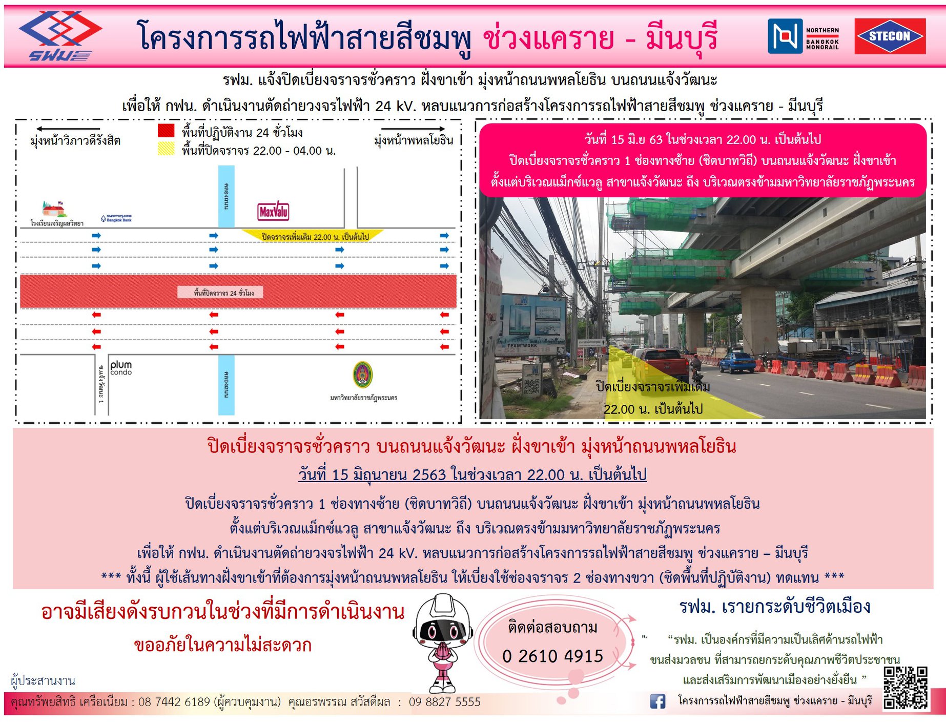 ปิดเบี่ยงจราจรชั่วคราว บนถนนแจ้งวัฒนะ ฝั่งขาเข้า มุ่งหน้าถนนพหลโยธิน ตั้งแต่บริเวณแม็กซ์แวลู ถึง บริเวณตรงข้าม ม.ราชภัฏพระนคร เพื่อให้ กฟน. ดำเนินงานตัดถ่ายวงจรไฟฟ้า 24 kV. หลบแนวการก่อสร้าง วันที่ 15 มิถุนายน 2563 เวลา 22.00 น. เป็นต้นไป
