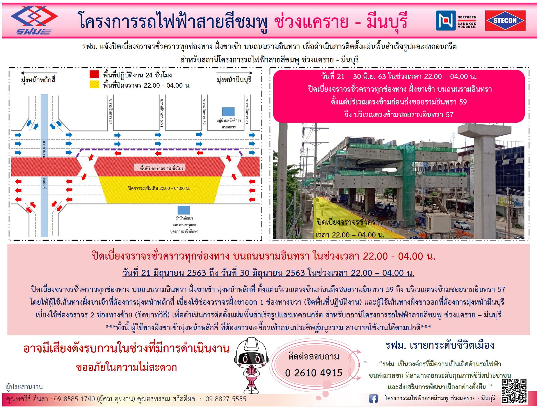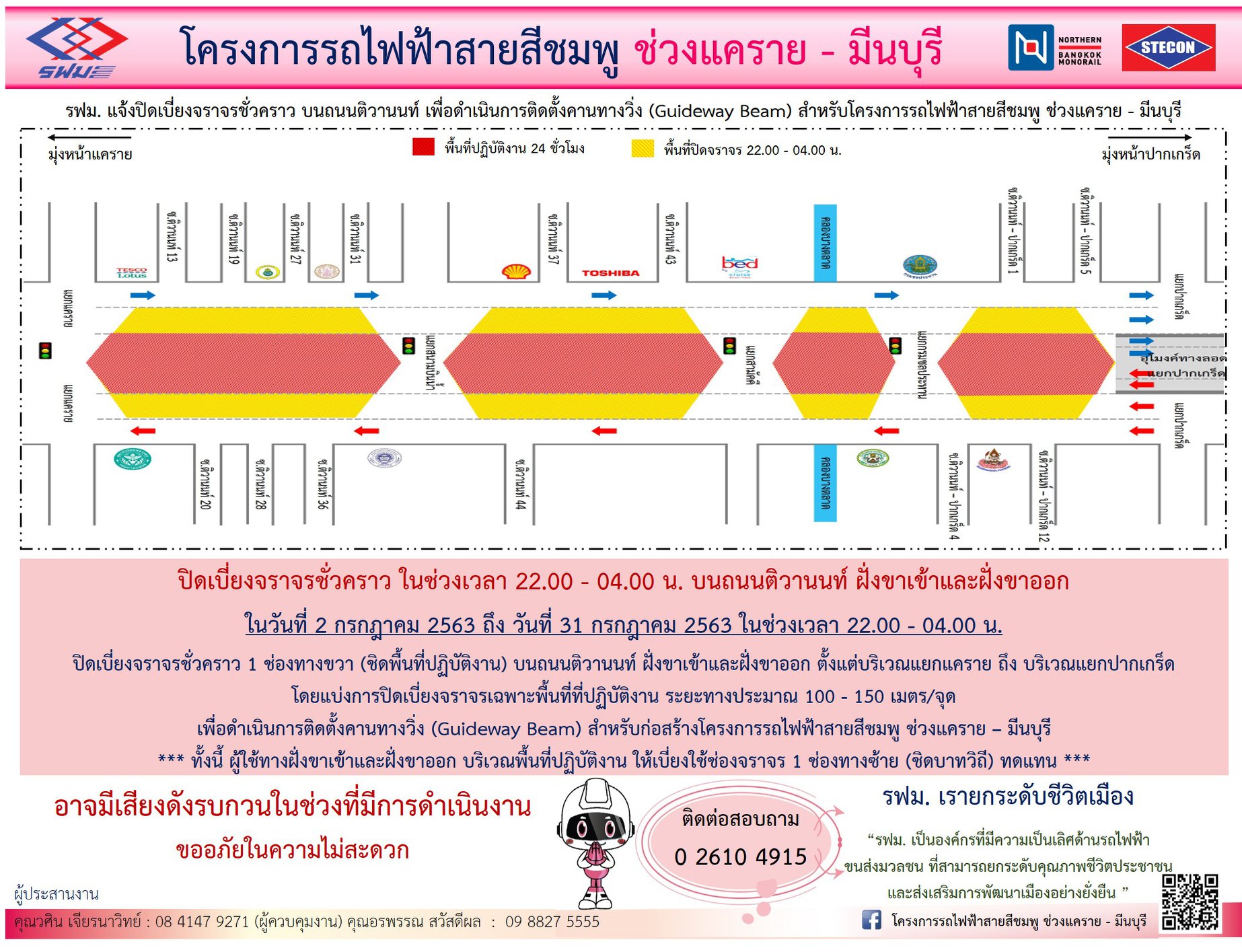 ปิดเบี่ยงจราจรชั่วคราว บนถนนติวานนท์ ถนนแจ้งวัฒนะ และถนนรามอินทรา ตั้งแต่บริเวณแยกแคราย ถึง บริเวณก่อนถึงแยกเมืองมีน เพื่อดำเนินการติดตั้งคานทางวิ่ง (Guideway Beam) วันที่ 2 กรกฎาคม 2563 ถึง วันที่ 31 กรกฎาคม 2563 เวลา 22.00 – 04.00 น.