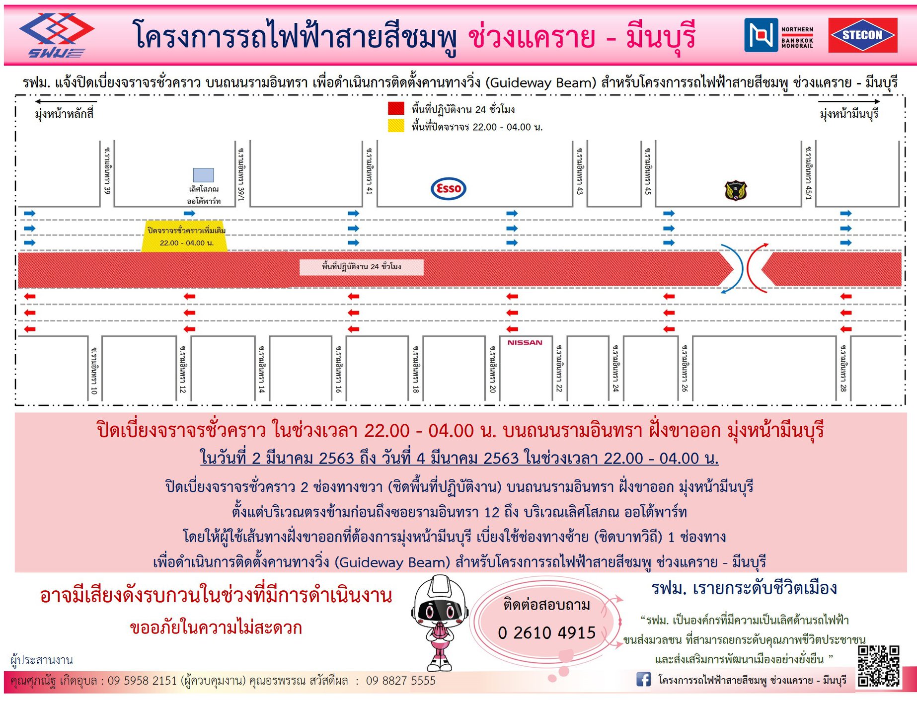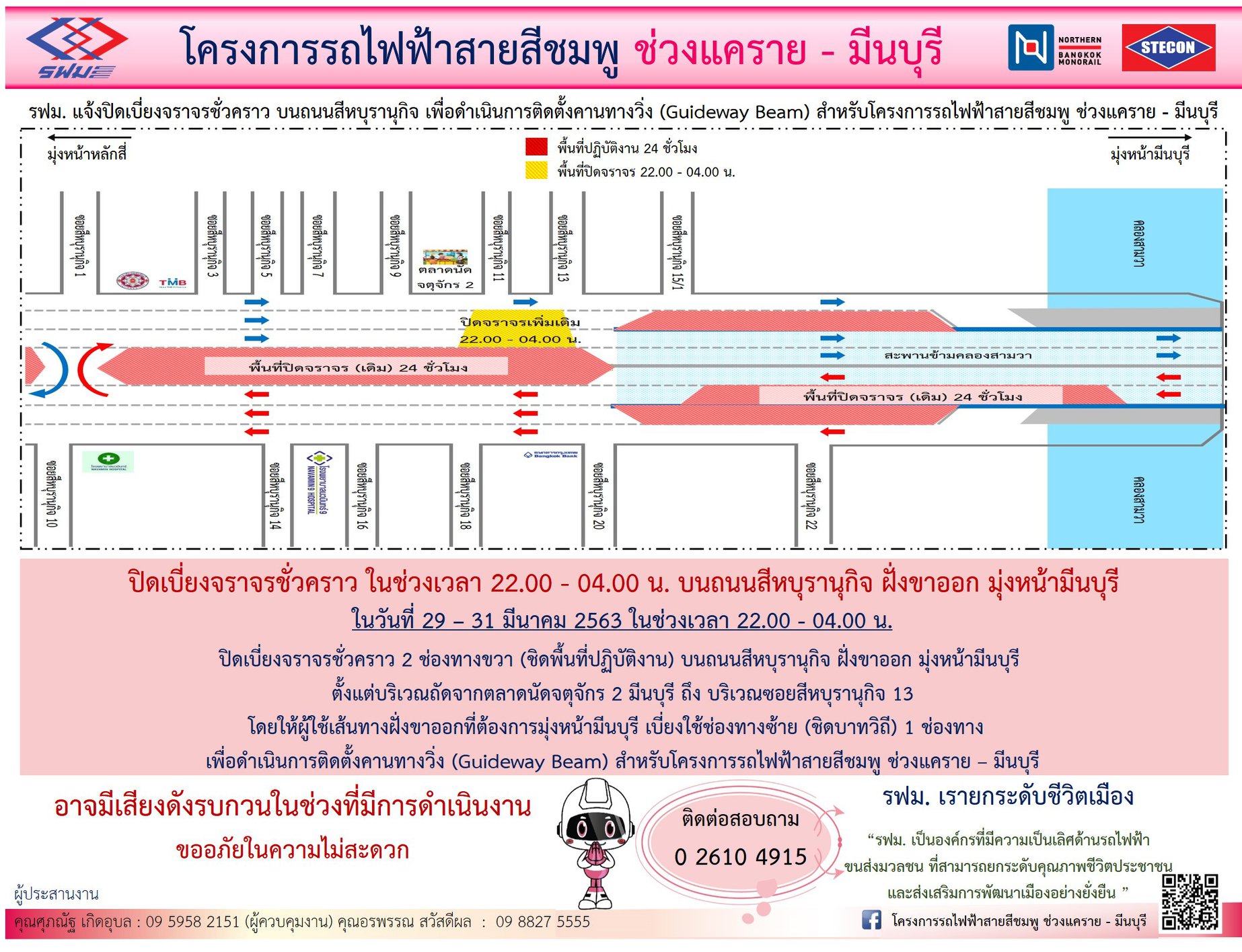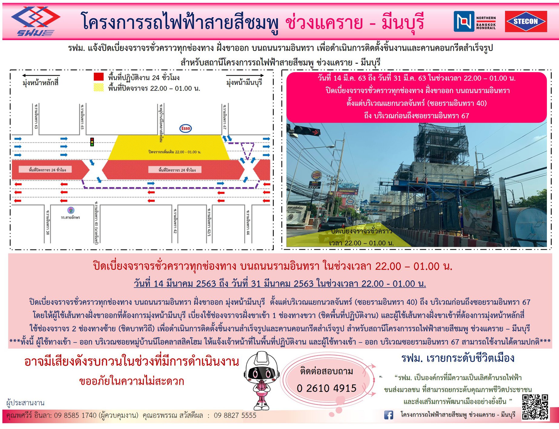 ปิดเบี่ยงจราจรชั่วคราวทุกช่องทาง บนถนนรามอินทรา ฝั่งขาเข้าและฝั่งขาออก เพื่อดำเนินการติดตั้งชิ้นงานสำเร็จรูปและคานคอนกรีตสำเร็จรูป สำหรับสถานี วันที่ 14 – 31 มีนาคม 2563