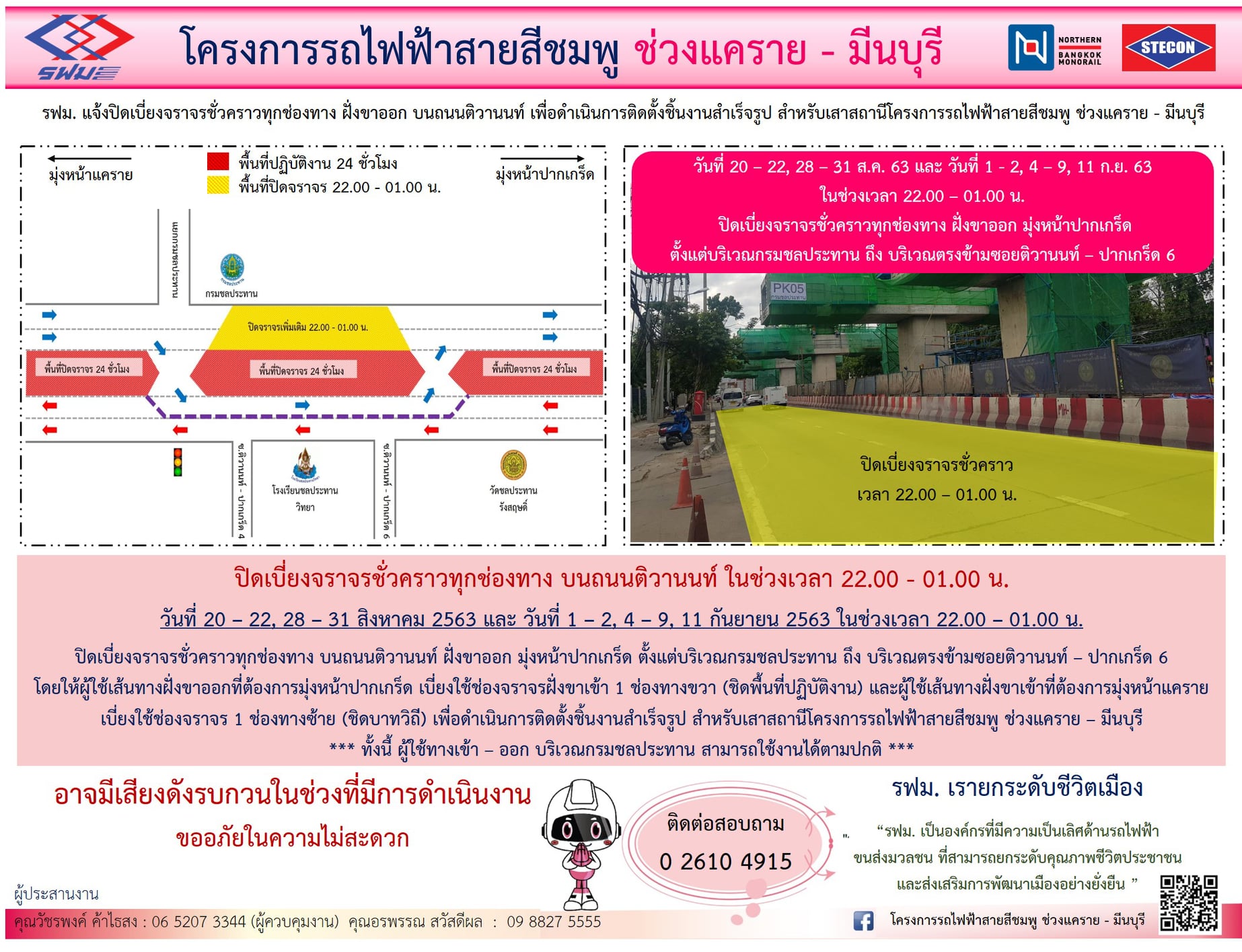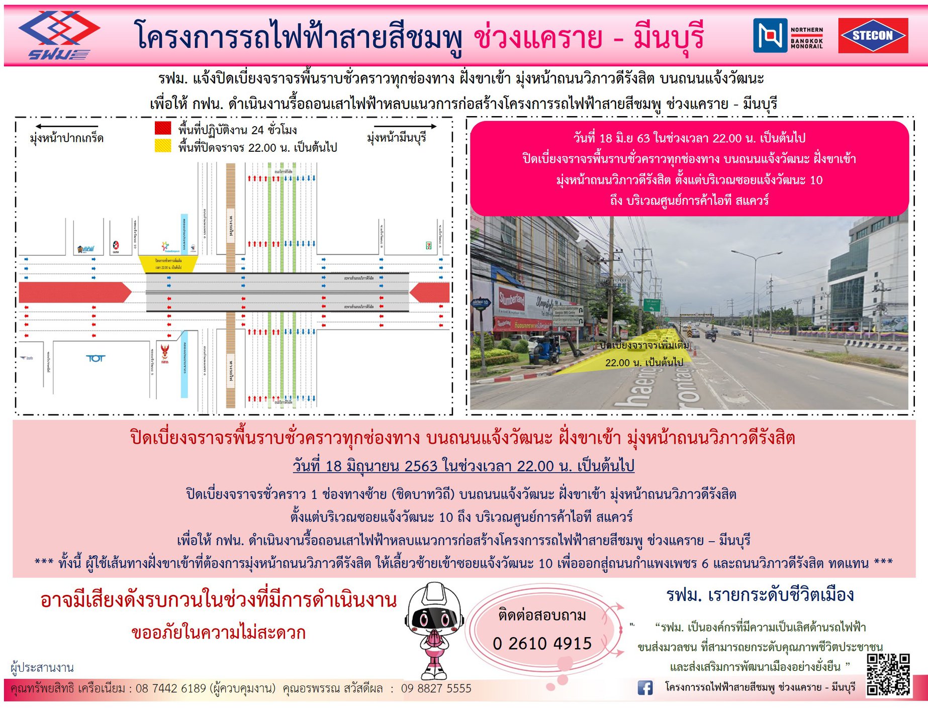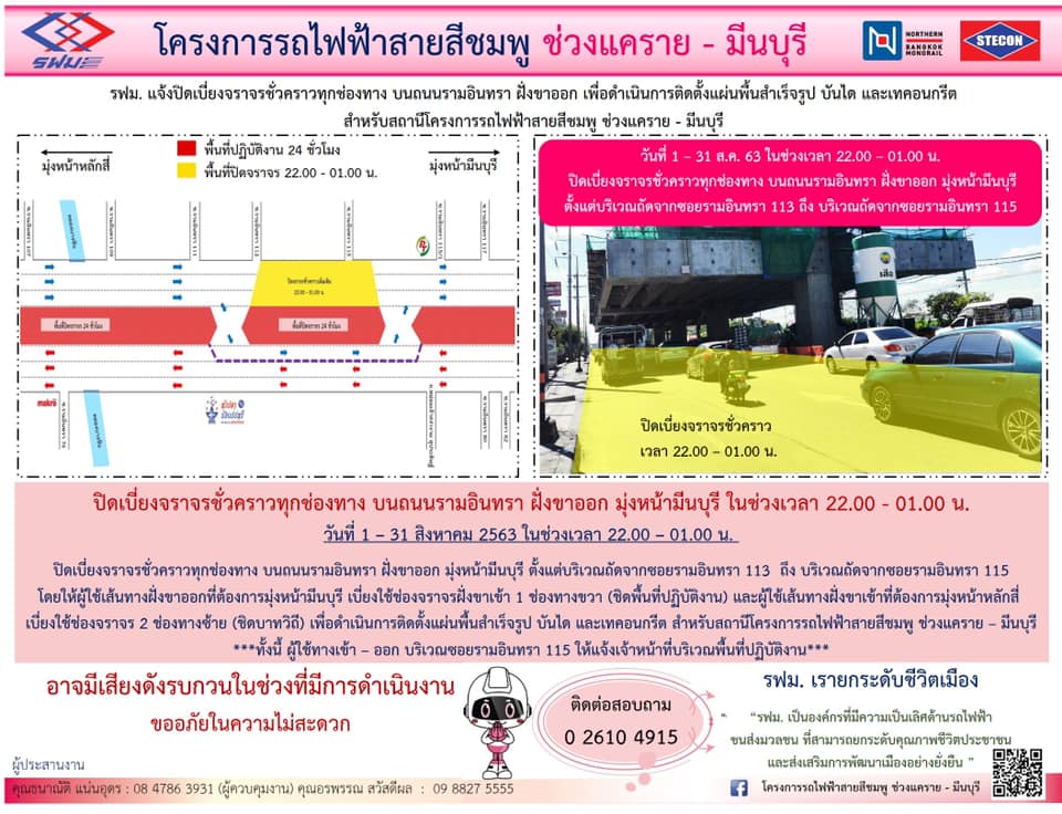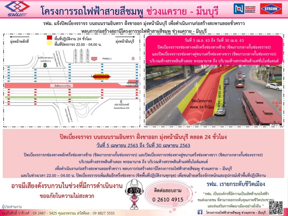 ปิดเบี่ยงจราจร บนถนนรามอินทรา ฝั่งขาออก เพื่อดำเนินงานก่อสร้างสะพานลอยชั่วคราว หลบการก่อสร้างสถานี วันที่ 5 – 30 เมษายน 2563