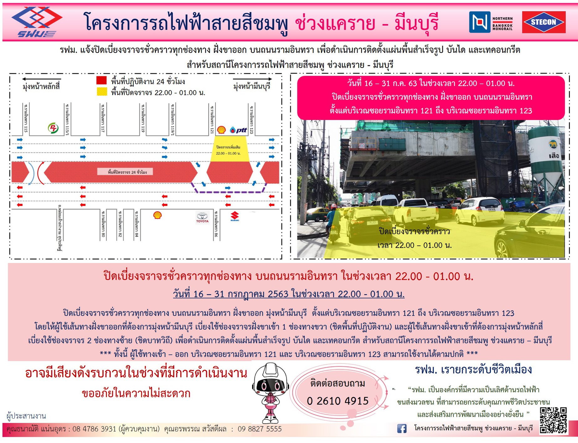 ปิดเบี่ยงจราจรชั่วคราวทุกช่องทาง บนถนนรามอินทรา ฝั่งขาเข้าและฝั่งขาออก ตั้งแต่บริเวณซอยรามอินทรา 121 ถึง บริเวณซอยรามอินทรา 123 เพื่อดำเนินการติดตั้งแผ่นพื้นสำเร็จรูป บันได และเทคอนกรีต วันที่ 16 – 31 กรกฎาคม 2563 เวลา 22.00 – 04.00 น.